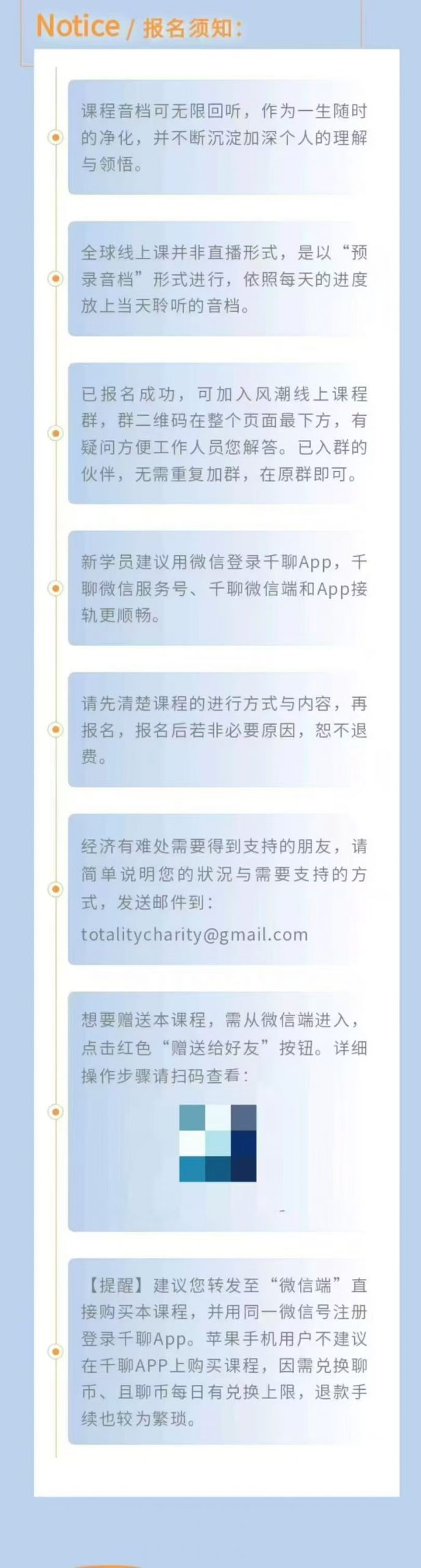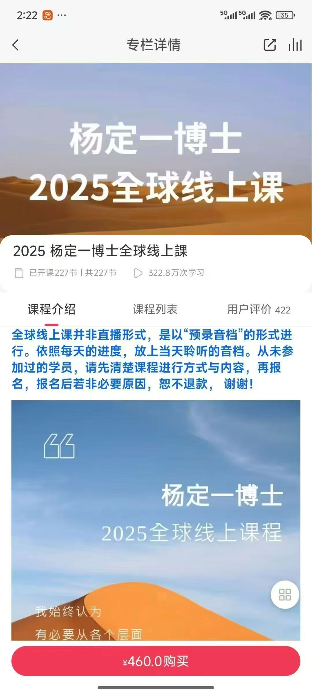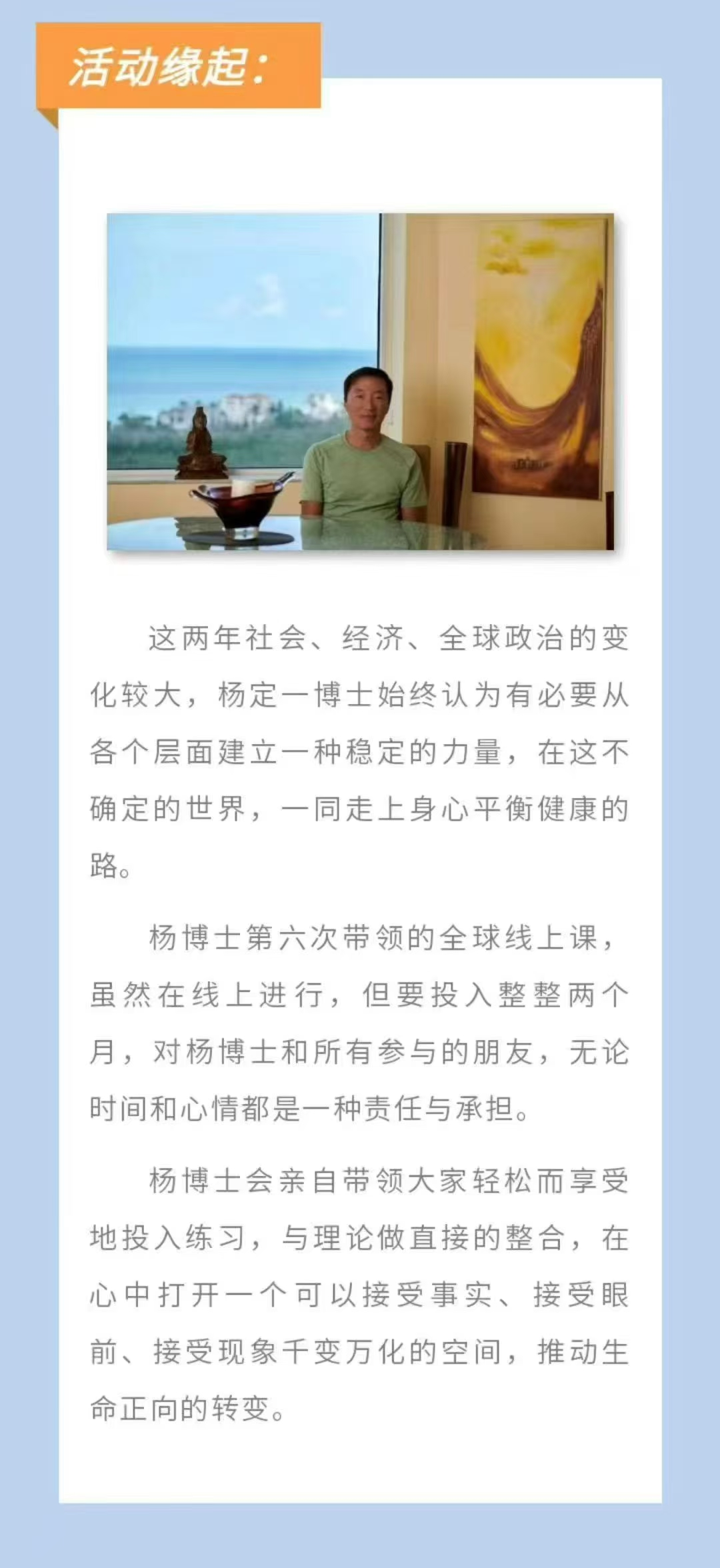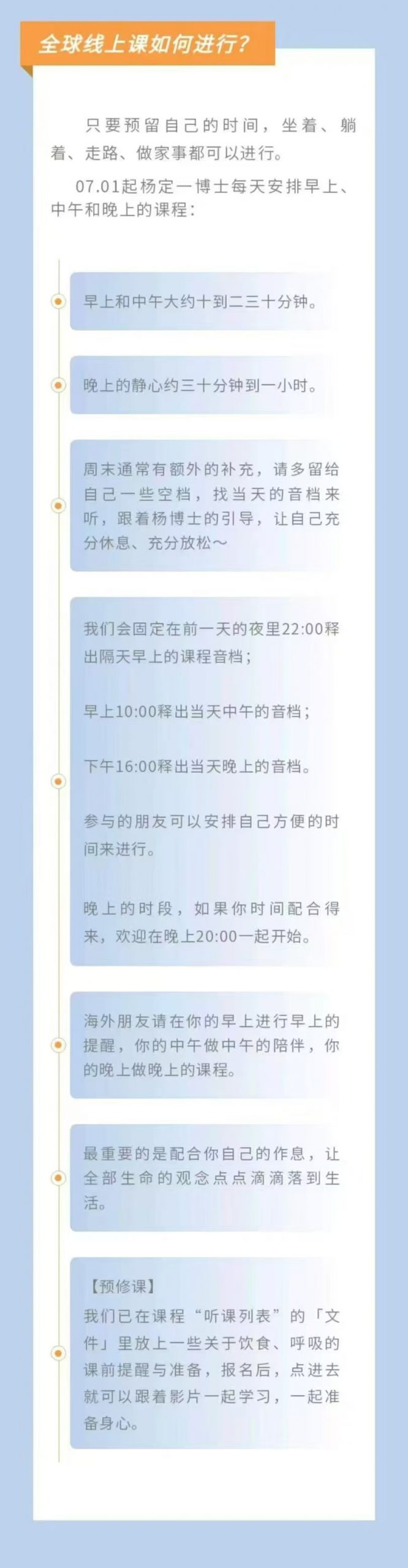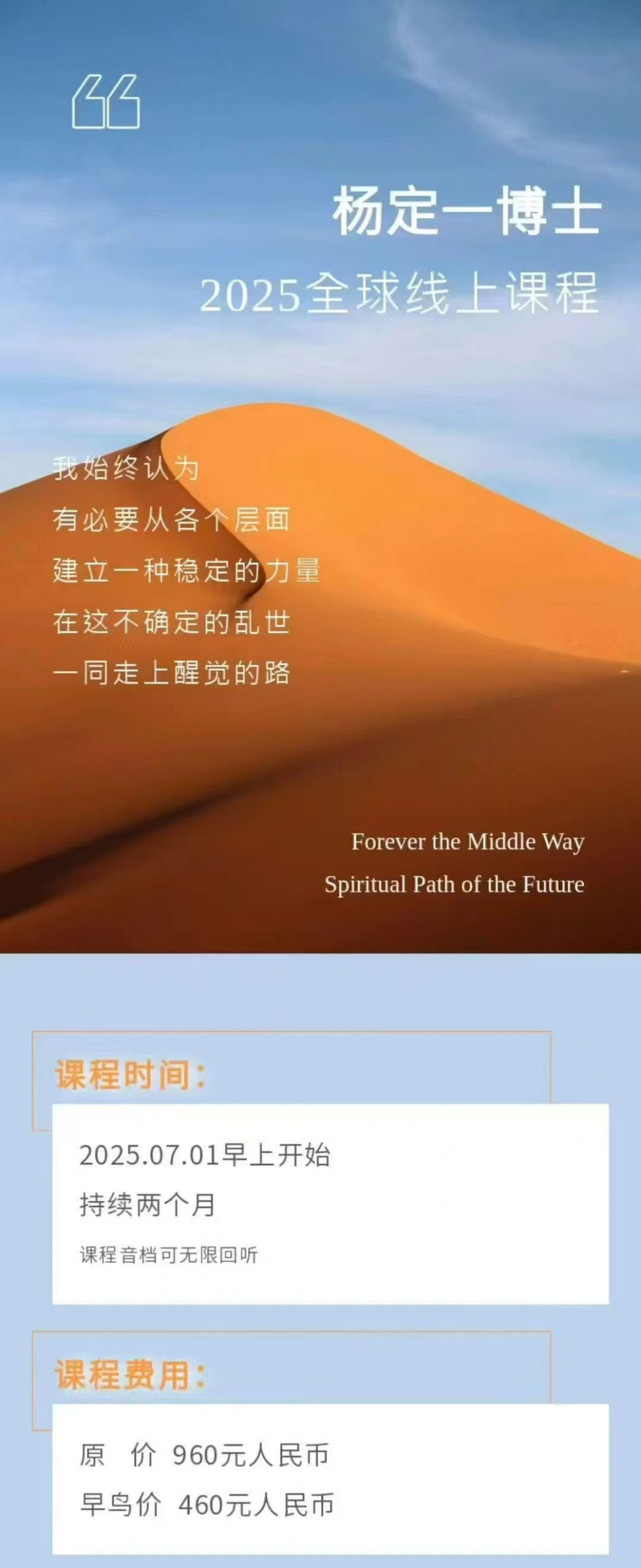 2025杨定一博士全球线上課静心29.9🧧音频200多节带配套文档活动缘起:这两年社会、经济、全球政治的变化较大,杨定一博士始终认为有必要从各个层面建立一种稳定的力量,在这不确定的世界,一同走上身心平衡健康的路。杨博士第六次带领的全球线上课,虽然在线上进行,但要投入整整两个月,对杨博士和所有参与的朋友,无论时间和心情都是一种责任与承担。杨博士会亲自带领大家轻松而享受地投入练习,与理论做直接的整合,在心中打开一个可以接受事实、接受眼前、接受现象千变万化的空间,推动生命正向的转变。全球线上课如何进行?只要预留自己的时间,坐着、躺着、走路、做家务都可以进行。杨定一博士2025全球线上课程我始终认为有必要从各个层面建立一种稳定的力量在这不确定的乱世一同走上醒觉的路Forever the Middle WaySpiritual Path of the Future课程音档可无限回听,作为一生随时的净化,并不断沉淀加深个人的理解与领悟。全球线上课并非直播形式,是以“预录音档”形式进行,依照每天的进度放上当天聆听的音档。已报名成功,可加入风潮线上课程群,群二维码在整个页面最下方,有疑问方便工作人员您解答。已入群的伙伴,无需重复加群,在原群即可。全球线上课如何进行?只要预留自己的时间,坐着、躺着、走路、做家务都可以进行。07.01起杨定一博士每天安排早上、中午和晚上的课程:早上和中午大约十到二三十分钟。晚上的静心约三十分钟到一小时。周末通常有额外的补充,请多留给自己一些空档,找当天的音档来听,跟着杨博士的引导,让自己充分休息、充分放松~我们会固定在前一天的夜里22:00释出隔天早上的课程音档;早上10:00释出当天中午的音档;下午16:00释出当天晚上的音档。参与的朋友可以安排自己方便的时间来进行。晚上的时段,如果你时间配合得来,欢迎在晚上20:00一起开始。海外朋友请在你的早上进行早上的提醒,你的中午做中午的陪伴,你的晚上做晚上的课程。最重要的是配合你自己的作息,让全部生命的观念点点滴滴落到生活。【预修课】我们已在课程“听课列表”的「文件」里放上一些关于饮食、呼吸的课前提醒与准备,报名后,点进去就可以跟着影片一起学习,一起准备身心。