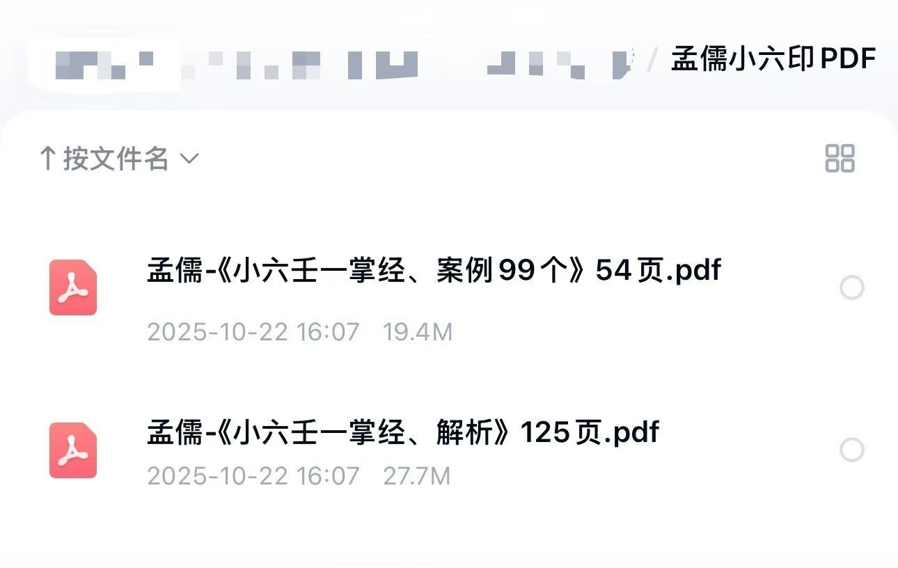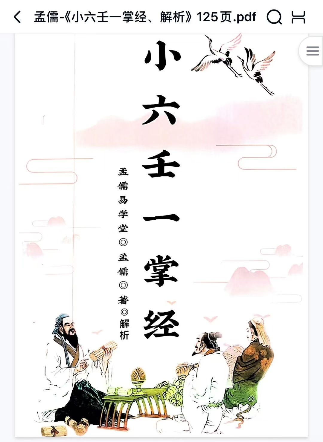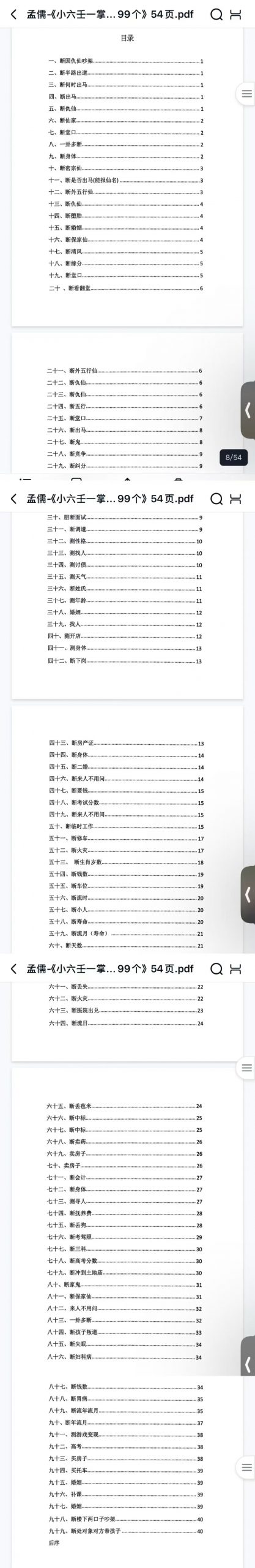 孟儒小六壬一掌经、解析125页+小六壬一掌经、案例99个,54页PDF9.9🧧孟儒小六壬断卦内容:!小六壬断卦内容:1、断工作:财运,事业,签约,投资,中标,入股,股票涨跌,职业、工资、合作,破财,负债,工程,跳槽,提干,升职,调工作,加薪,提拔。失业。受骗,辞职,炒鱿鱼,卖楼,断啥时候给你电话2、断考试:晋级,通过,及格,待定,笔试,面试,考试分数,小学考试分数,初中考试分数,高中考试分数,大学考试,中考分数,高考分数,奖学金。校长,老师,公务员,中间人,学生不听话,叛逆,不听话,撒谎,说话难听。3、断婚姻:情人,外遇,出轨,姻缘,对象,单身,小三,闪婚,离婚,二婚,没离利索,分手,异性缘,寻花问柳,沾花惹草,一见钟情,父母包办,结婚领症。怀孕,先生孩子后结婚,约会,感情,恋爱,暧昧。4、断官司:口舌, 是非,小人,诅咒,扯后腿,拘留,牢狱,贵人。官司,败诉,打架,被告!5、断失物方向,男女,距离,颜色,个头,人信、丢失。6、断信息:相貌、个头,身高、脸型、衣着颜色、性格、年龄,生肖,姓名。7、身体实病: 呼吸道,炎症,骨病,泌尿,头部,腰部,四肢,肝胆,胆囊炎,胆手术,胃炎,胃有火,胃手术,肠道,肺炎,肺气肿,颈椎病,腰腿疼,脑出血,脑血栓,高血压,半身不遂,火灾,烫伤,烧伤,流感,肠胃感冒,高烧,消化,便秘,病灾,白事,车祸,癌症,肿瘤。寿命。8、身体虚病:惊吓,冲幢,外科病,癔病,家傀,外傀,横死傀,游魂野傀,白煞,红煞,土瘟訷,城隍庙,冲到城隍土地庙,保家苮闹事,胡黄苮,出马苮。9、断仙家:家苮,外苮,胡苮,黄苮,先天一㑽人㐷,后天一㑽人㐷,一㑽人㐷一㑽兵,外五行苮,内五行苮,密宗苮,各种仇苮,老辈香根,是否出㐷,四梁八柱不全,还阴债,断各种关煞。10、各种化解化解惊吓,冲幢,家傀,外傀,横死傀,家苮,外苮,保家苮,白煞,红煞,土瘟訷,游魂野傀,化解胡黄,化解各种关煞。11、断出行:出差,旅游、外地,走之动象,外出。12、择吉:择日、择时。13、断应期:流年流月日流流时,精确到日流流时,断天数,断具日体期,具几体点。14、随机起卦:外应法、时分间割法、报数法,扑克课起法,名字起课法,文起字课法。15、断卦思详路解、 经总验结,灵活运用,命点理窍,占技卜巧。16、先公天式(四柱小六壬)后天公式巧掌妙握,快起速卦17、包含99个真案实例分享,案解例析,各种战实例子分析!目录见下图