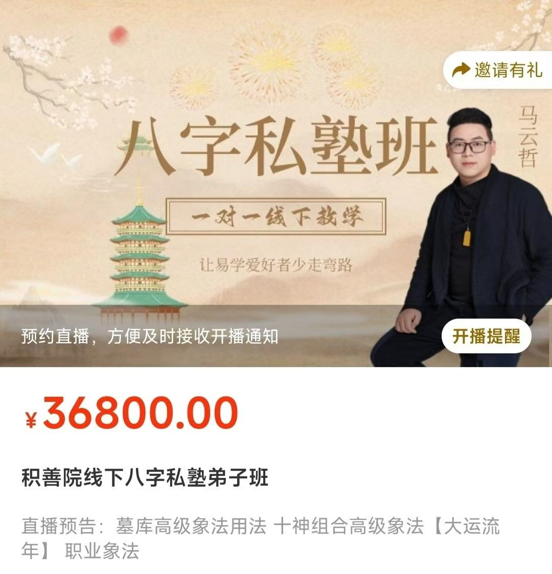 马云哲线下八字私塾弟子班99🧧系统班批八字,独门秘法统领格局!独门绝技劫印化晋格独门绝技十神格局独门秘法五行伤官格独门绝技天地门独门绝技日主意向独门绝技大运流年应期独门秘法断婚姻绝技感情/婚姻/多情多婚多家/入赘八字/无婚/晚婚/早婚/性冷淡/阳痿/小三/克夫克妻/合婚/结婚择日等断财运绝技【求财方式/财富格局】