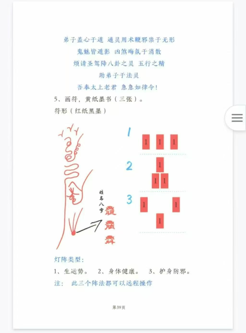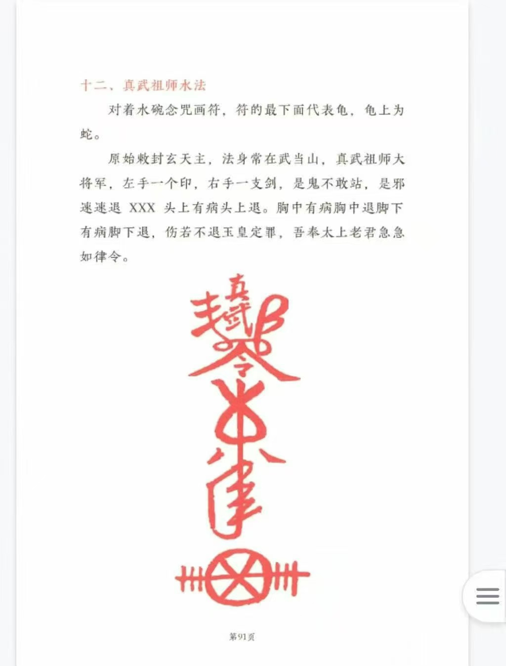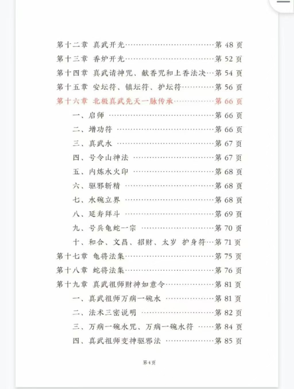 玄天真武祖师高清电子版彩色97页第一章 金丹万灵符第二章 入病人家-防邪气沾身第三章 真武祖师临坛化煞法第四章 真武祖师大变神法第五章 真武祖师金光内练法第六章 真武祖师打凶法第七章 龟蛇二将召合一宗第八章 龟蛇二将平安镇宅符第九章 龟蛇二将惩恶罚凶一宗第十章 铜镜开光法第十一章 真武三六灯阵法一、驱邪和治煞。二、身体健康和护身防邪三、引气入宅法四、人缘阵(此法可增人缘)五、情侣感情阵六、家庭和睦阵第十二章 真武开光第十三章 香炉开光第十四章 真武请神咒第十五章 安坛符、镇坛符第十六章 北极真武先天一脉一、启师二、增功符三、真武水四、号令山神法五、内炼水火印六、驱邪斩精七、水碗立界八、延寿拜斗九、号兵龟蛇一宗十、文昌、招财、太岁第十七章 龟将法集第十八章 蛇将法集第十九章 真武祖师财神如意令一、真武祖师万病一碗水二、法术三密说明:三、万病一碗水咒、符四、真武祖师变神驱邪法五、真武祖师肿瘤搬家法六、真武祖师敕符法七、真武祖师护身法八、真武祖师藏身法九、高能水碗加持法十、玄天上帝诀(玄天指应急)十一、真武祖师移病令十二、真武祖师水法十三、真武祖师讨债法十四、收徒表文十五、五雷令-退伤驱邪消煞十六、万事和合令法十七、鸿运招财令十八、大开如意财门令