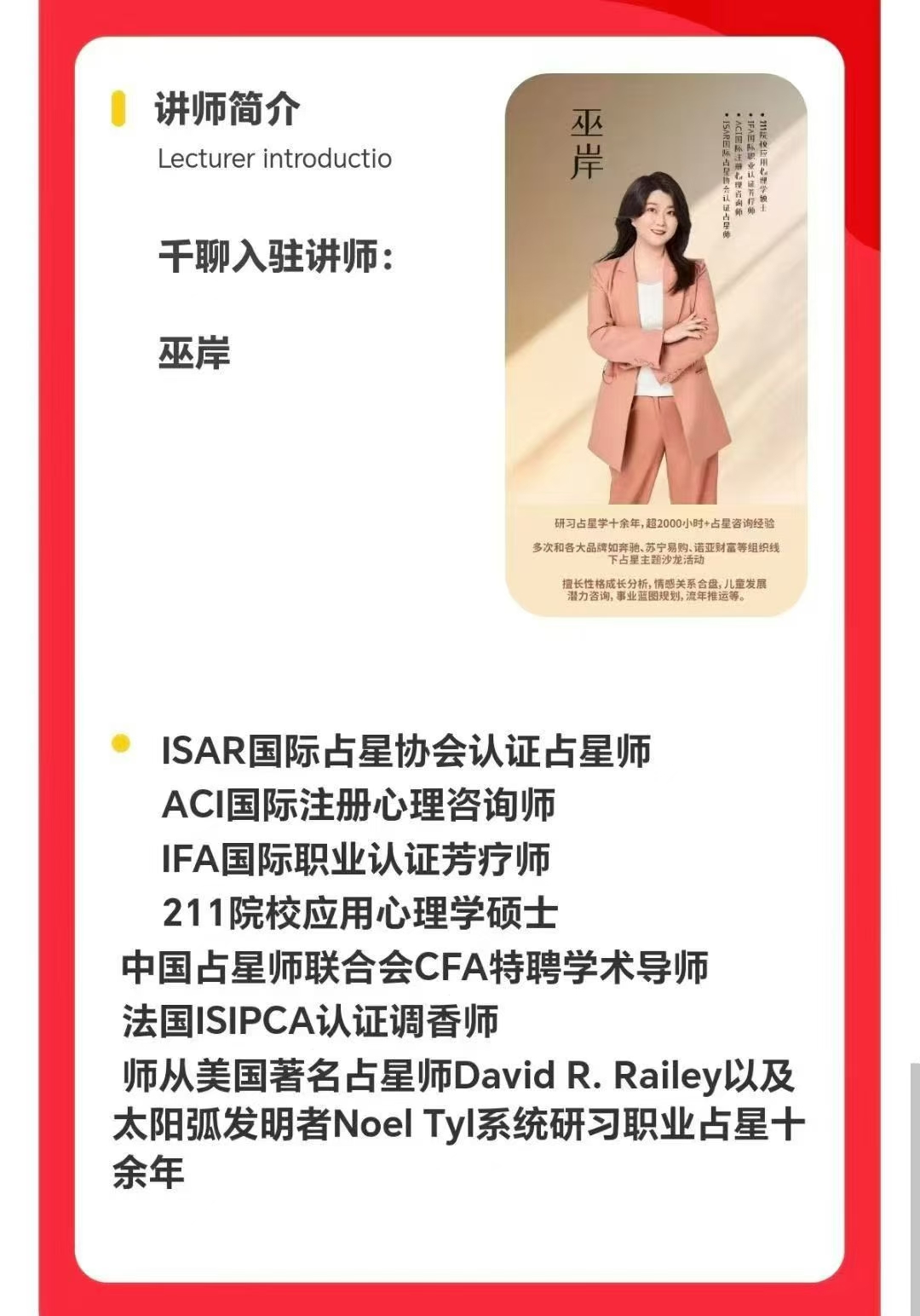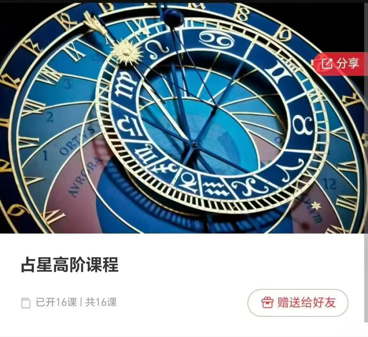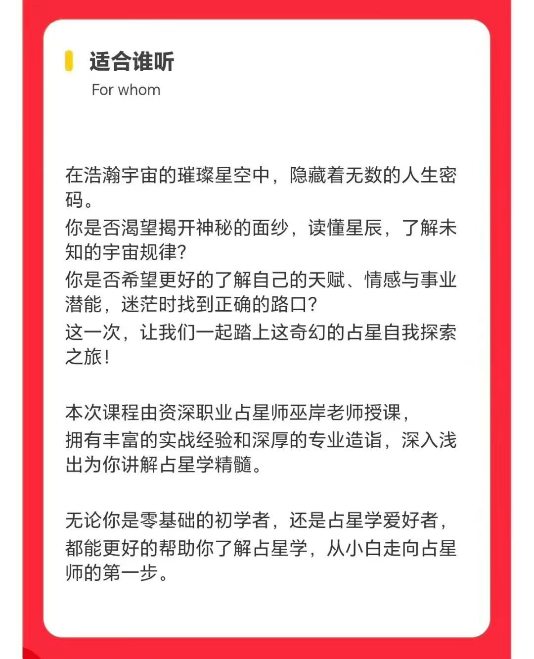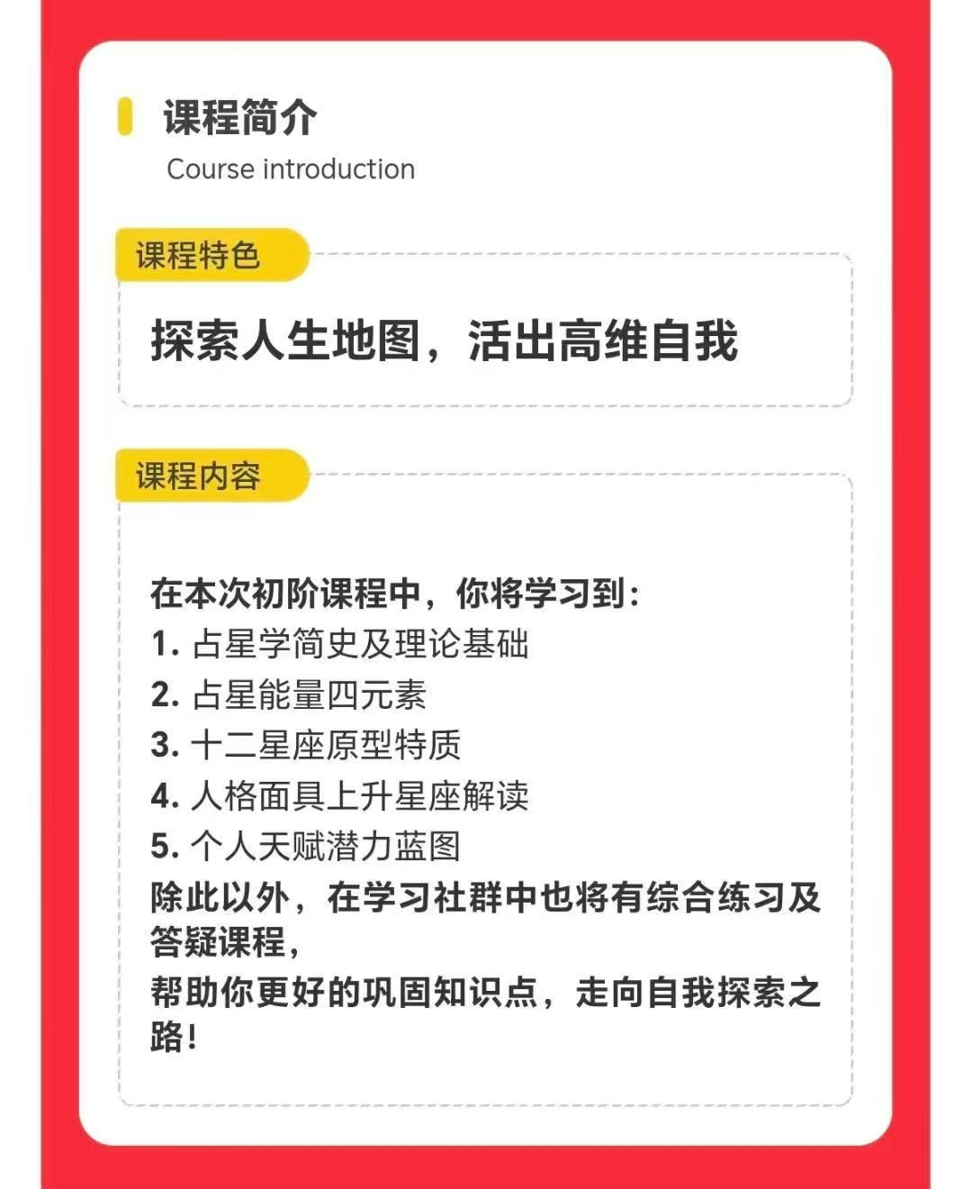 巫岸老师·占星初阶+中阶+高阶[爱心](共三套课程系统课【导师简介:巫岸】ISAR国际占星协会认证占星师IFA国际职业认证芳疗师今211院.校应用心理学硕士研习占星学十余年,20o0小时+占星咨询经验多次和各大品牌如奔驰、苏宁易购、诺亚财富等组织线下占星主题沙龙活动师从美国著名占星师David R. Railey以及太阳弧发明者Noel Tyl系统研习职业占星十余年, 多次和各大品牌如奔驰、苏宁易购、诺亚财富等组织线下占星主题沙龙活动。人本主义占星师,致力于陪伴客户成长,擅长性格成长分析,情感关系合盘,儿童发展潜力咨询,事业蓝图规划,流年推运等。1⃣️初阶课程:课程特色探索人生地图,活出高维自我课程内容在本次初阶课程中,你将学习到:1.占星学简史及理论基础2.占星能量四元素3.十二星座原型特质4.人格面具上升星座解读5.个人天赋潜力蓝图除此以外,在学习社群中也将有综合练习及答疑课程, 帮助你更好的巩固知识点,走向自我 探索之路!无论你是零基础的初学者,还是占星学爱好者, 都能更好的帮助你了解占星学,从小白走向占星师的第一步。2⃣️中阶课程:课程亮点√十二宫位×行星能量全解密×占星推运√星盘综合解盘技术(情感/事业/财富/健康)√五大人生议题深度专研×实战技巧适合人群想系统提升占星技术的占星爱好者渴望开展副业的斜杠青年心理咨询师/教育工作者/人力资源从业者追求自我认知升级的深度採探索者3⃣️高阶课程:🌟12大必修模块🌟相位深度解析个人事业蓝图规划身心亲子成长占星运势咨询伦理规范个人星盘进阶身心健康指引运势周期全息个案实战演练亲密关系解读原生家庭影响推运技法基础督导进阶提升本故事纯属虚构,如有雷同纯属巧合
