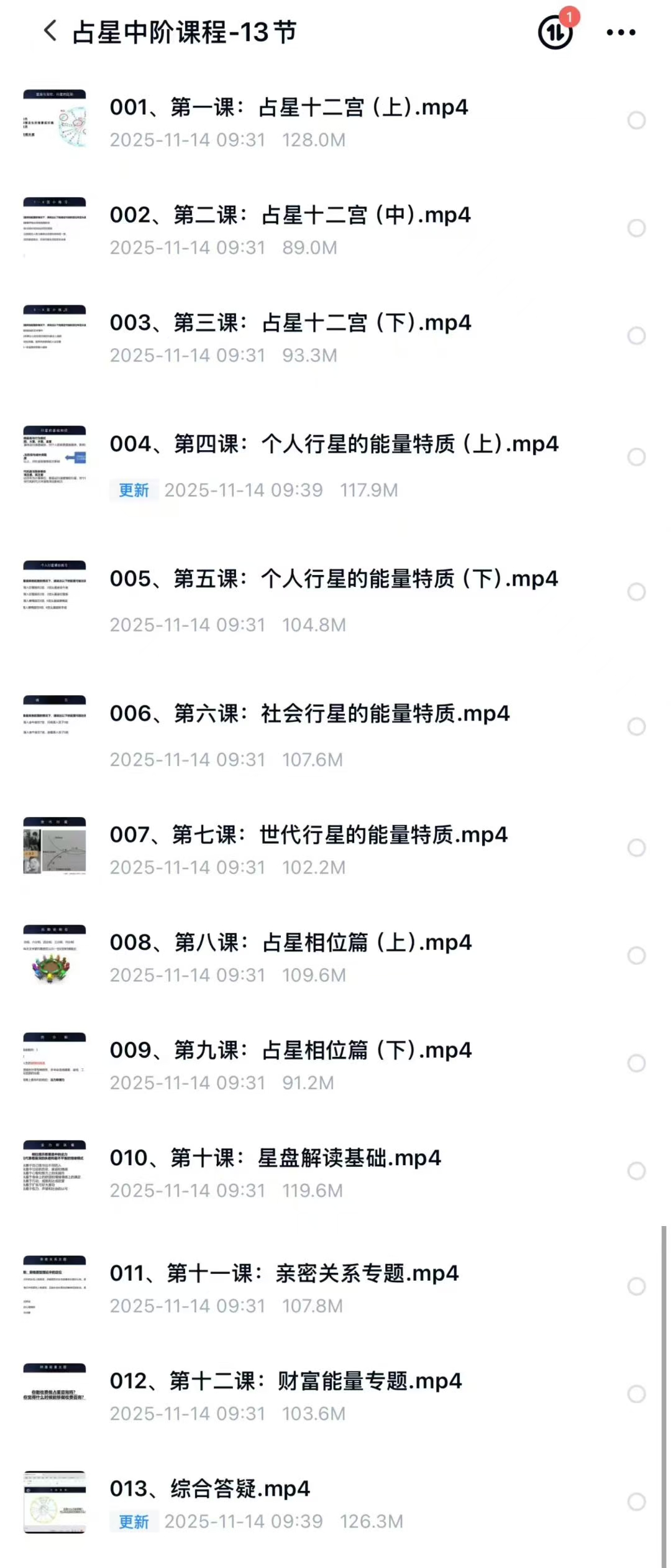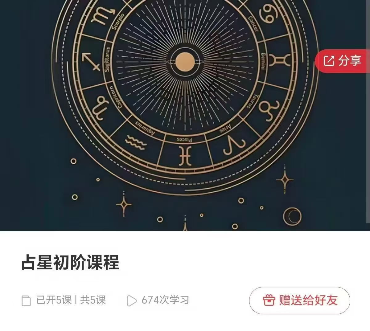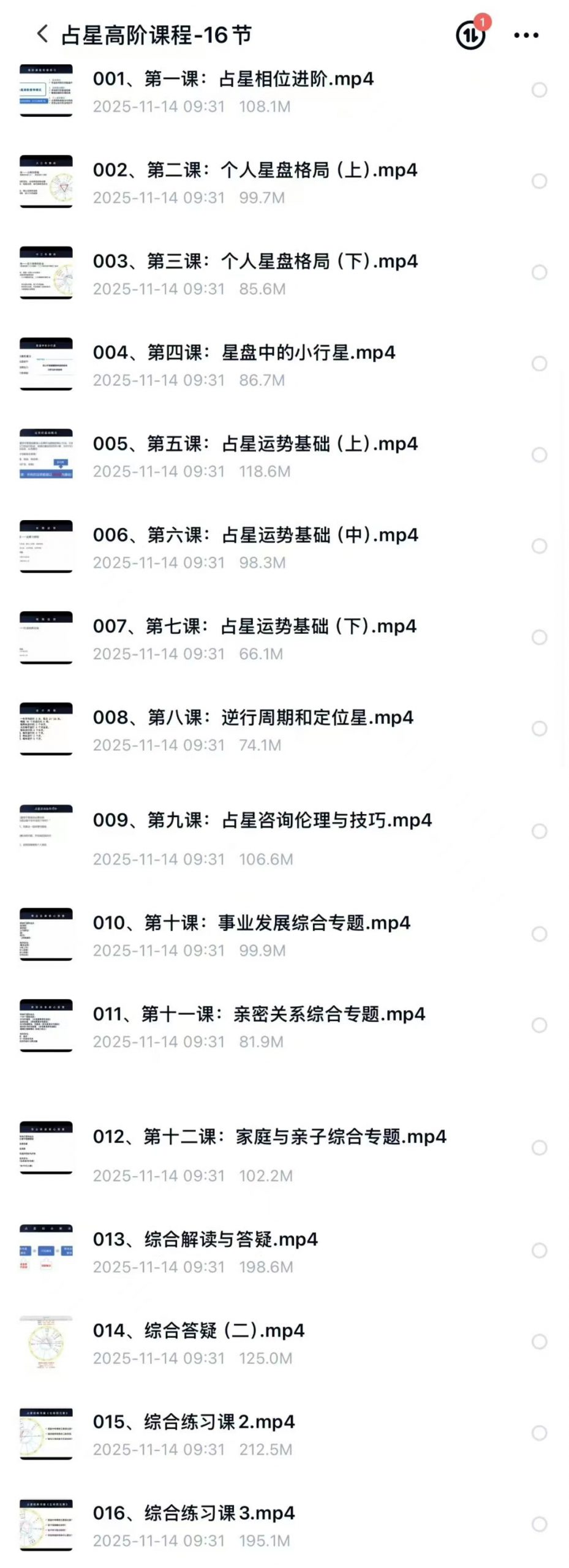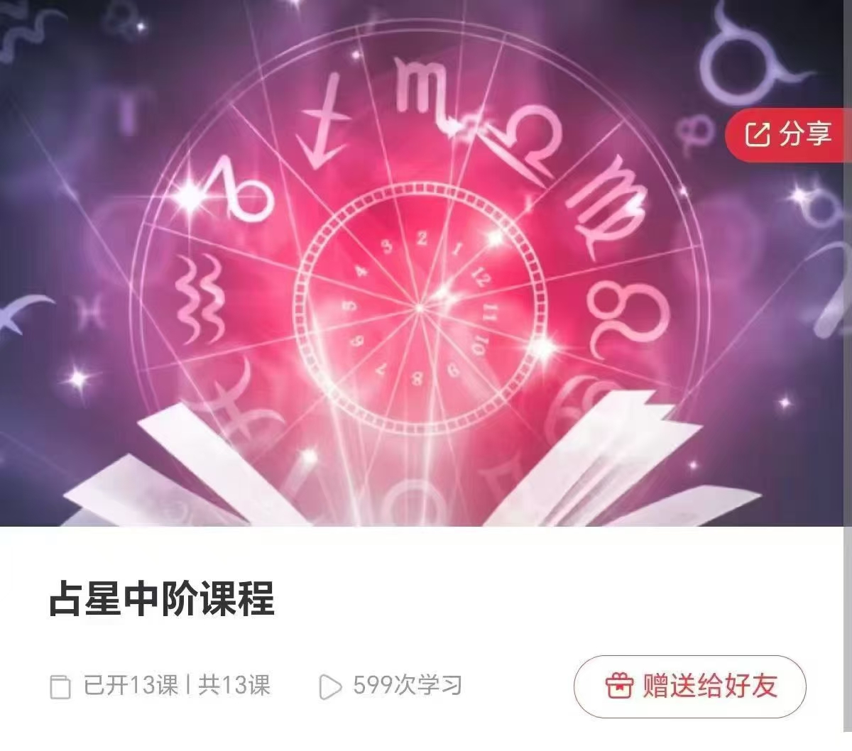 巫岸老师·占星初阶+中阶+高阶[爱心](共三套课程系统课【导师简介:巫岸】ISAR国际占星协会认证占星师IFA国际职业认证芳疗师今211院.校应用心理学硕士研习占星学十余年,20o0小时+占星咨询经验多次和各大品牌如奔驰、苏宁易购、诺亚财富等组织线下占星主题沙龙活动师从美国著名占星师David R. Railey以及太阳弧发明者Noel Tyl系统研习职业占星十余年, 多次和各大品牌如奔驰、苏宁易购、诺亚财富等组织线下占星主题沙龙活动。人本主义占星师,致力于陪伴客户成长,擅长性格成长分析,情感关系合盘,儿童发展潜力咨询,事业蓝图规划,流年推运等。1⃣️初阶课程:课程特色探索人生地图,活出高维自我课程内容在本次初阶课程中,你将学习到:1.占星学简史及理论基础2.占星能量四元素3.十二星座原型特质4.人格面具上升星座解读5.个人天赋潜力蓝图除此以外,在学习社群中也将有综合练习及答疑课程, 帮助你更好的巩固知识点,走向自我 探索之路!无论你是零基础的初学者,还是占星学爱好者, 都能更好的帮助你了解占星学,从小白走向占星师的第一步。2⃣️中阶课程:课程亮点√十二宫位×行星能量全解密×占星推运√星盘综合解盘技术(情感/事业/财富/健康)√五大人生议题深度专研×实战技巧适合人群想系统提升占星技术的占星爱好者渴望开展副业的斜杠青年心理咨询师/教育工作者/人力资源从业者追求自我认知升级的深度採探索者3⃣️高阶课程:🌟12大必修模块🌟相位深度解析个人事业蓝图规划身心亲子成长占星运势咨询伦理规范个人星盘进阶身心健康指引运势周期全息个案实战演练亲密关系解读原生家庭影响推运技法基础督导进阶提升本故事纯属虚构,如有雷同纯属巧合