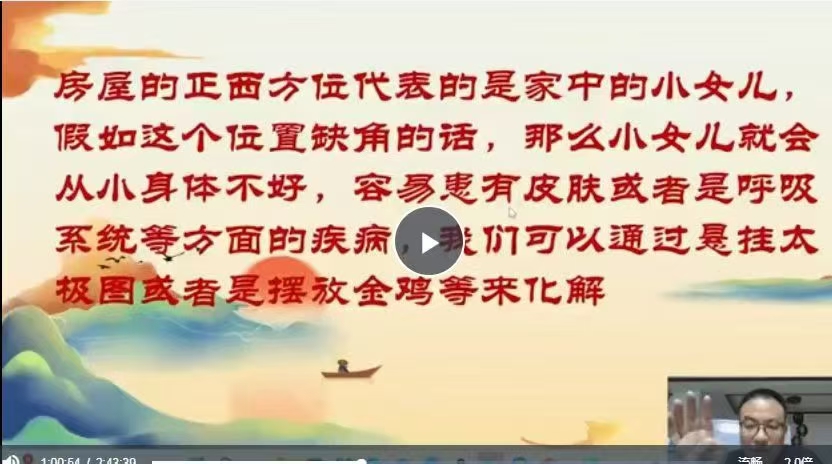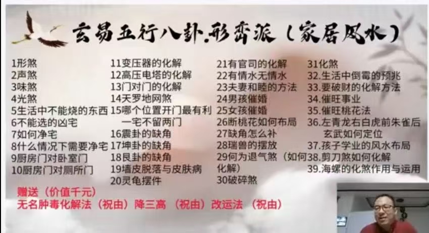 王英杰-玄易五行八卦 形峦派(家居风水)200元线上网课3集视频课2声煞3味煞4光煞5生活中不烧能的东西6不能选的凶宅7如何净宅8什么情况下要需净宅9厨房对门卧室门10厨房门厕对所门11变压器的化解12高压电塔化的解13门对的门化解14天罗地网煞15哪个置位开门最有一利宅不留两门16震的卦缺角17坤的卦缺角18艮卦的缺角19墙皮脱落与皮肤病20灵龟摆件21有官司的化解22有情水情无水23夫妻睦和的方法24男孩催婚25女催孩婚26断桃花何如布局27缺角怎么补28瑞兽的摆放29何为气退煞(如化何解)30破碎煞31化煞32.生活中霉倒的预兆33.要破财化的解方法34.催旺事业35.催旺花桃法36.左青龙白右虎前朱雀后武玄如何定位37.孩子学业的水风布局38.剪刀煞如化何解39.海螺化的煞作用运与用赠送(价千值元)无名肿毒化解法(祝由)降三高(祝由)改运法(祝由)
