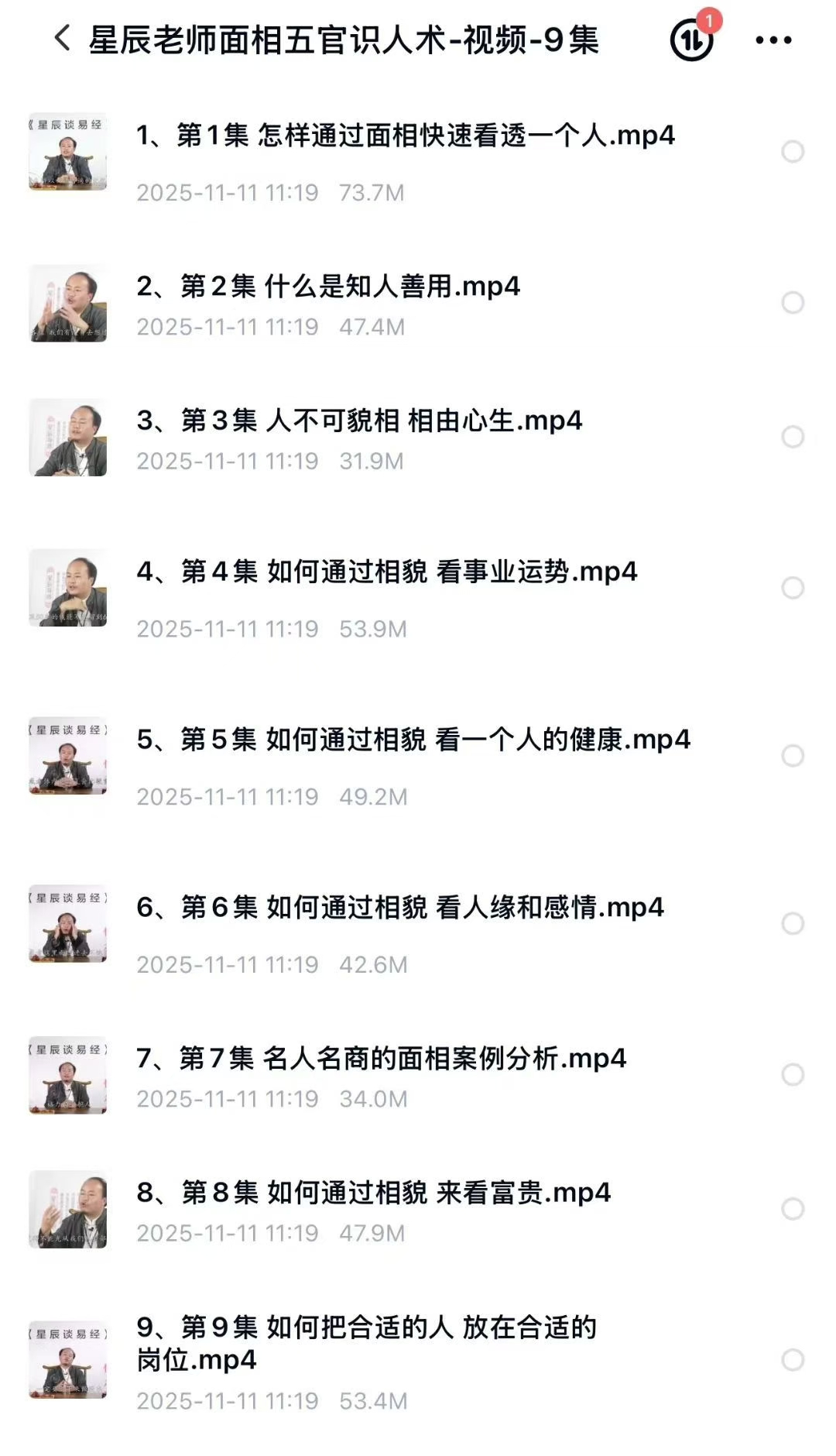 星辰老师面相五官识人术视频9集声音清晰,通俗易懂.第1集 怎样通过面相快速看透一个人第2集 什么是知人善用.mp4第3集 人不可貌相 相由心生.mp4第4集 如何通过相貌 看事业运势第5集 如何通过相貌 看一个人的健康第6集 如何通过相貌 看人缘和感情第7集 名人名商的面相案例分析第8集 如何通过相貌 来看富贵第9集如何把合适的人 放在合适的岗位