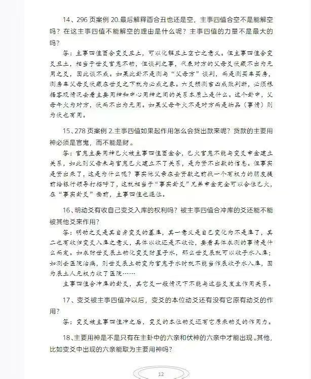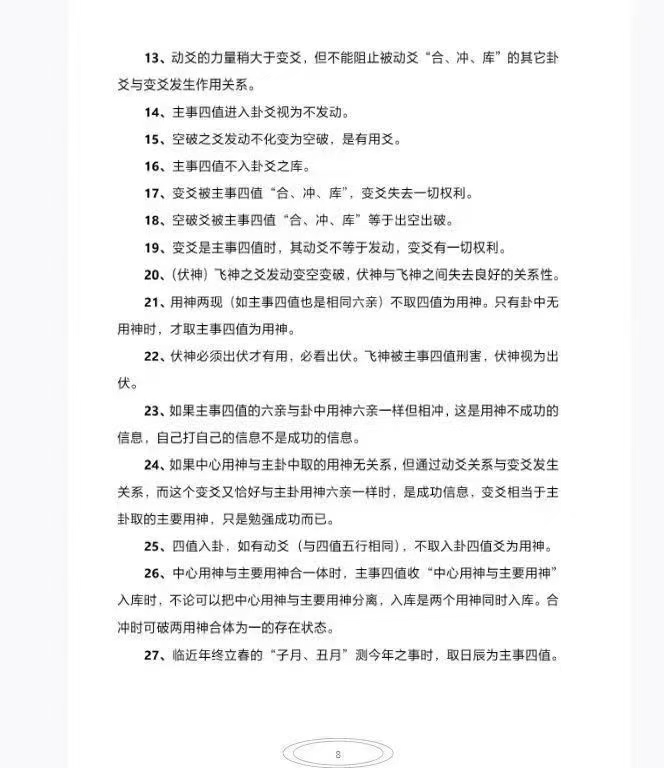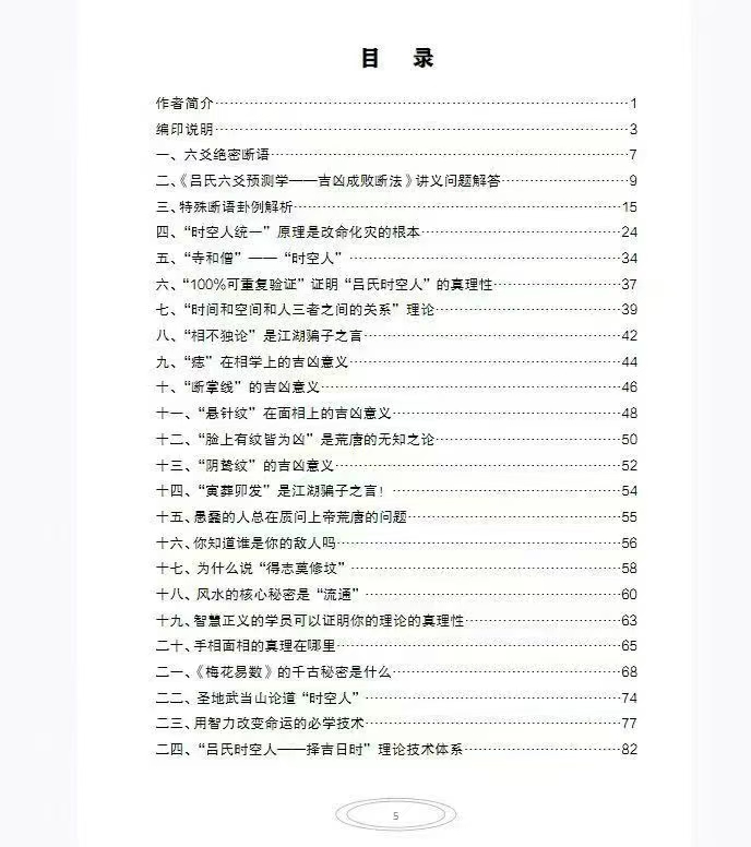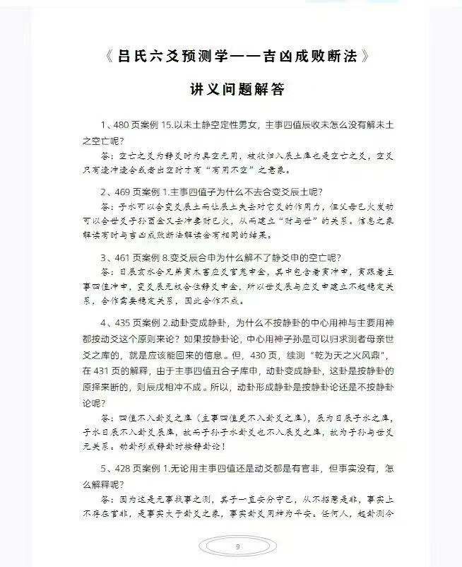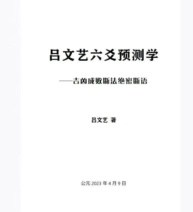 吕文艺六爻预测学吉凶成败断法绝密断语115页,电子版书籍介绍:本断语资料,是对《吕文艺六爻预测学——吉凶成败断法》讲义资料的补充与完善。本断语资料:一是对《吕文艺六爻预测学——吉凶成败断法》讲义中众多师友难以理解的卦例进行了更充分的详细解读;二是对《吕文艺六爻预测学——吉凶成败断法》讲义中没有讲过的“六爻卦吉凶成败断法”的理论技术规定进行了集中展示;三是补充了一部分“六爻卦吉凶断法”的特殊规定断语(在各案例中体现,因有些规定离开案例无法说明白)。在本断语资料中有一个母亲连续七次求测儿子能否被某大学录取为研究生的案例,这些理论彻底打败了传统六爻“卦不过三”的荒谬江湖说法,也直接证明了“吕文艺六爻预测学”理论技术的真理性。