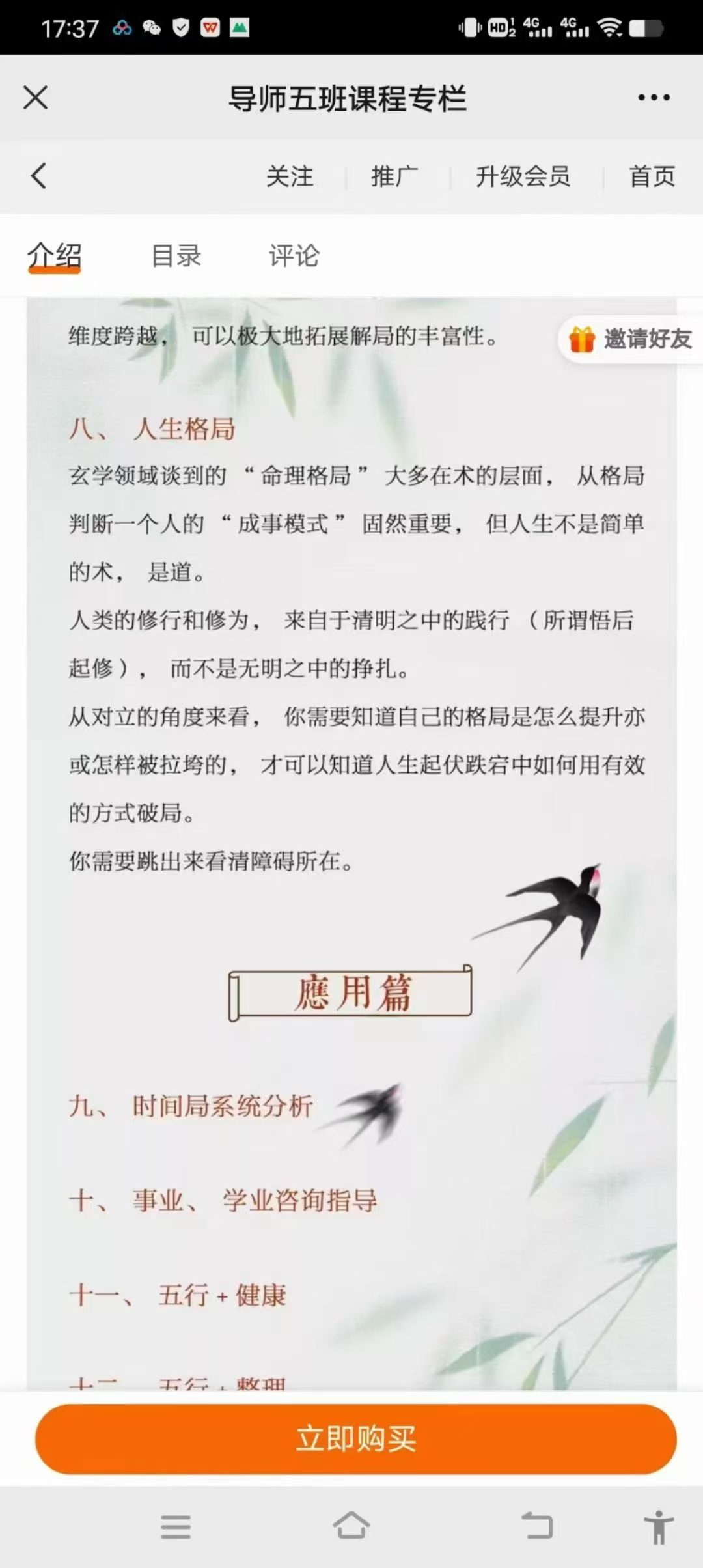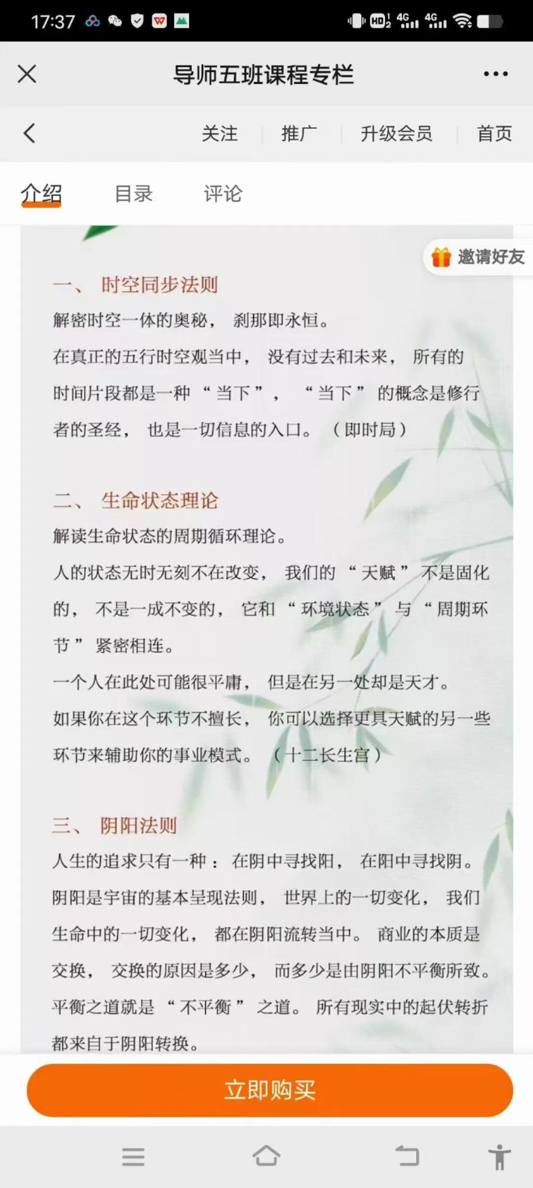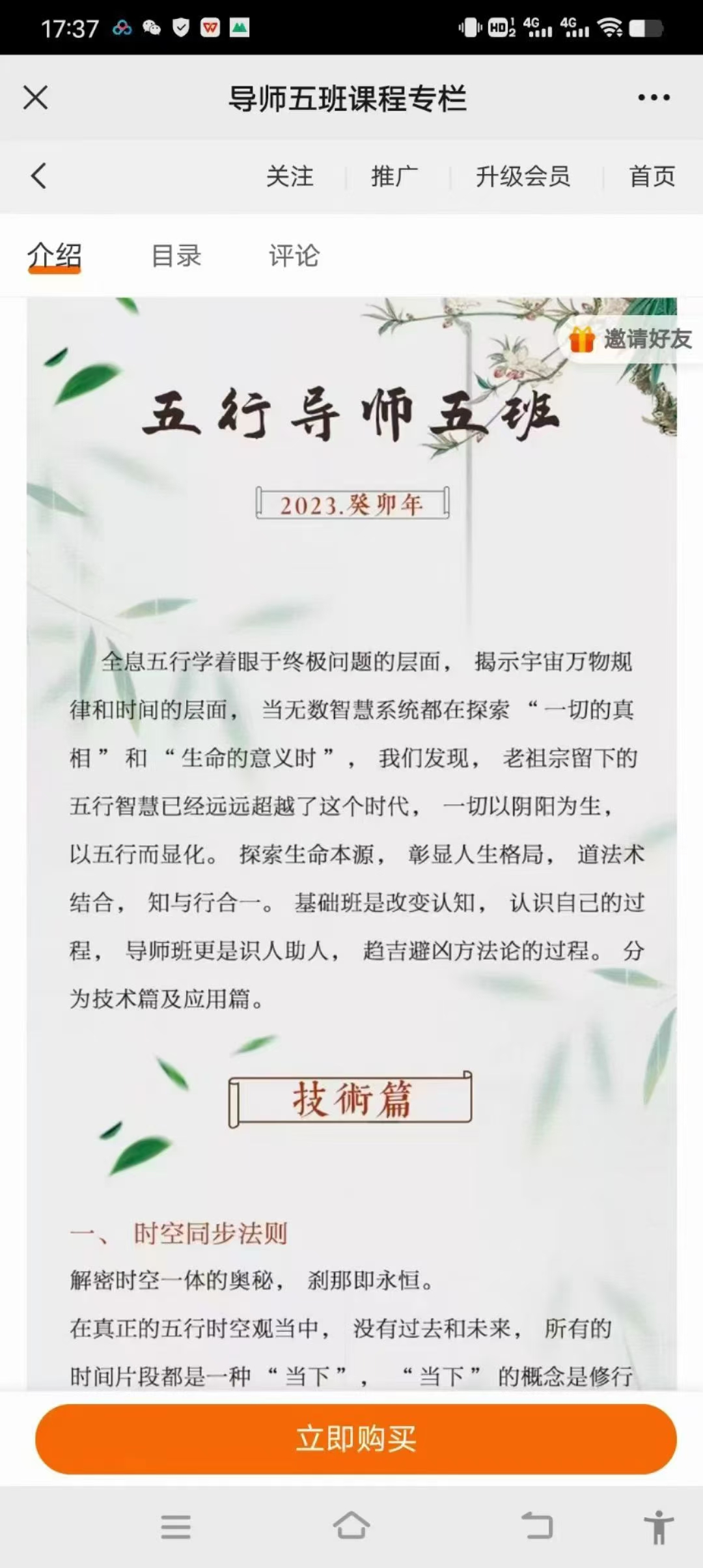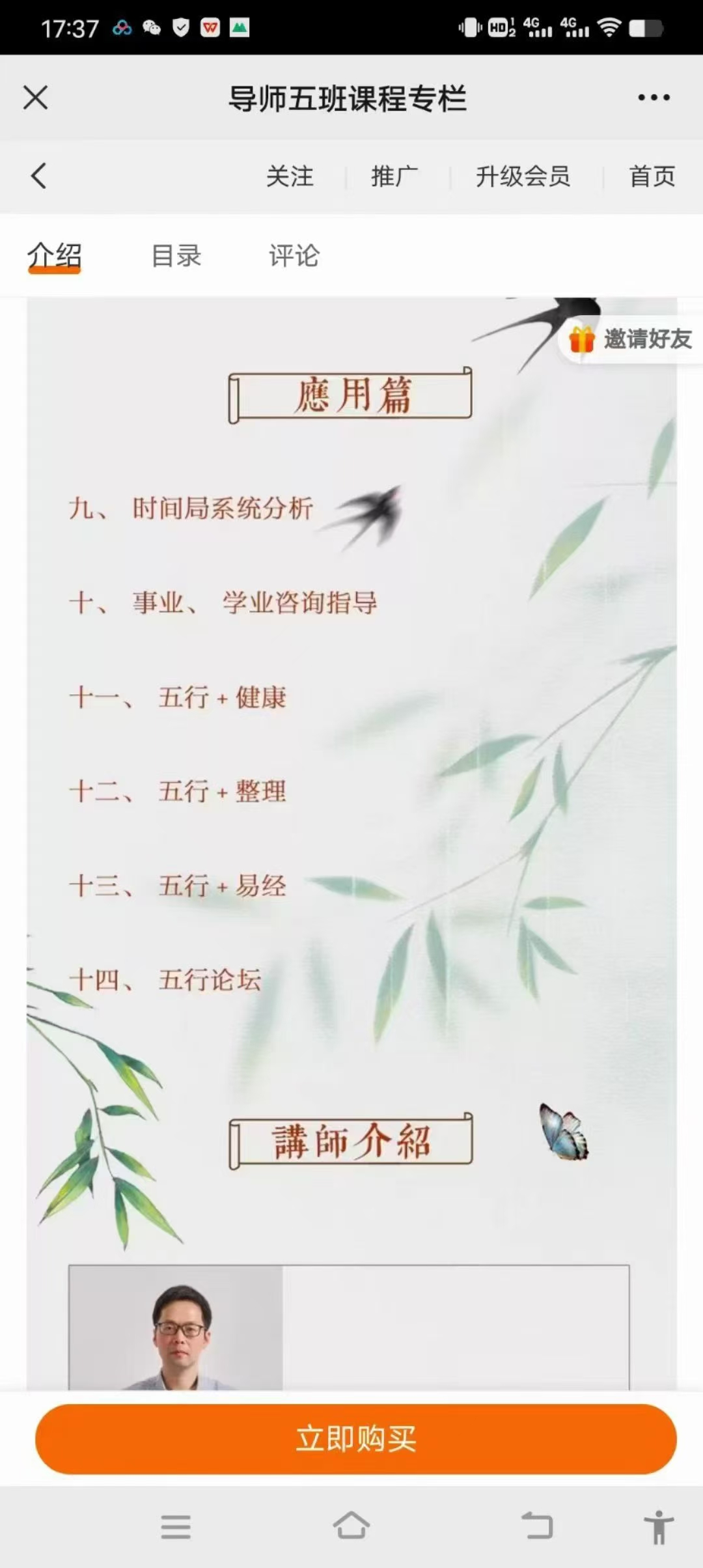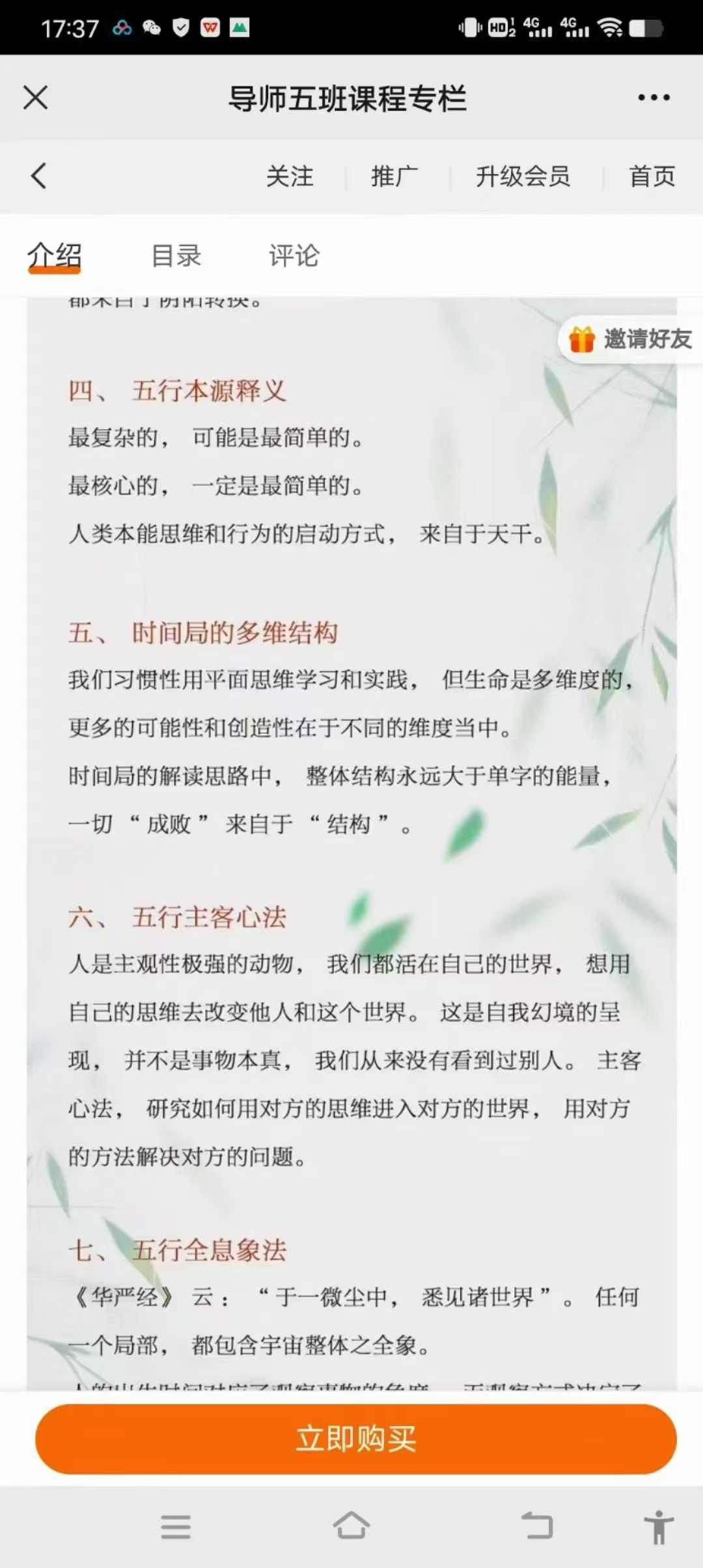 五行课程!洛谦五行导师班17集视频一、 时空同步法则解密时空一体的奥秘,刹那即永恒。在真正的五行时空观当中,没有过去和未来,所有的时间片段都是一种 “当下”, “当下”的概念是修行者的圣经, 也是一切信息的入口。(即时局)二、 生命状态理论解读生命状态的周期循环理论。人的状态无时无刻不在改变,我们的“天赋”不是固化的,不是一成不变的, 它和“环境状态”与“周期环节”紧密相连。一个人在此处可能很平庸,但是在另一处却是天才。如果你在这个环节不擅长,你可以选择更具天赋的另一些环节来辅助你的事业模式。(十二长生宫)三、阴阳法则人生的追求只有一种:在阴中寻找阳,在阳中寻找阴。阴阳是宇宙的基本呈现法则,世界上的一切变化,我们生命中的一切变化,都在阴阳流转当中。商业的本质是交换,交换的原因是多少,而多少是由阴阳不平衡所致。平衡之道就是“不平衡”之道。所有现实中的起伏转折四、 五行本源释义最复杂的,可能是最简单的。最核心的,一定是最简单的。人类本能思维和行为的启动方式,来自于天干。五、时间局的多维结构我们习惯性用平面思维学习和实践, 但生命是多维度的,更多的可能性和创造性在于不同的维度当中。时间局的解读思路中,整体结构永远大于单字的能量,一切“成败”来自于“结构”。六、 五行主客心法人是主观性极强的动物,我们都活在自己的世界, 想用自己的思维去改变他人和这个世界。 这是自我幻境的呈现,并不是事物本真, 我们从来没有看到过别人。 主客心法, 研究如何用对方的思维进入对方的世界, 用对方的方法解决对方的问题。七、 五行全息象法《华严经》云:“于一微尘中,悉见诸世界”。 任何應用篇九、时间局系统分析十、 事业、 学业咨询指导十一、 五行+健康十二、五行+整理十三、五行+易经十四、五行论坛