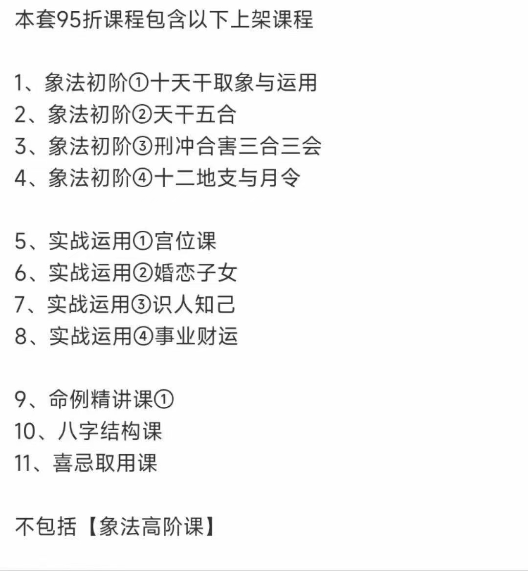 芝芝 象法课程包94集视频包含以下上架课程1、象法初阶①十天干取象与运用2、象法初阶②天干五合3、象法初阶③刑冲合害三合三会4、象法初阶④十二地支与月令5、实战运用①宫位课6、实战运用②婚恋子女7、实战运用③识人知己8、实战运用④事业财运9、命例精讲课10、八字结构课11、喜忌取用课