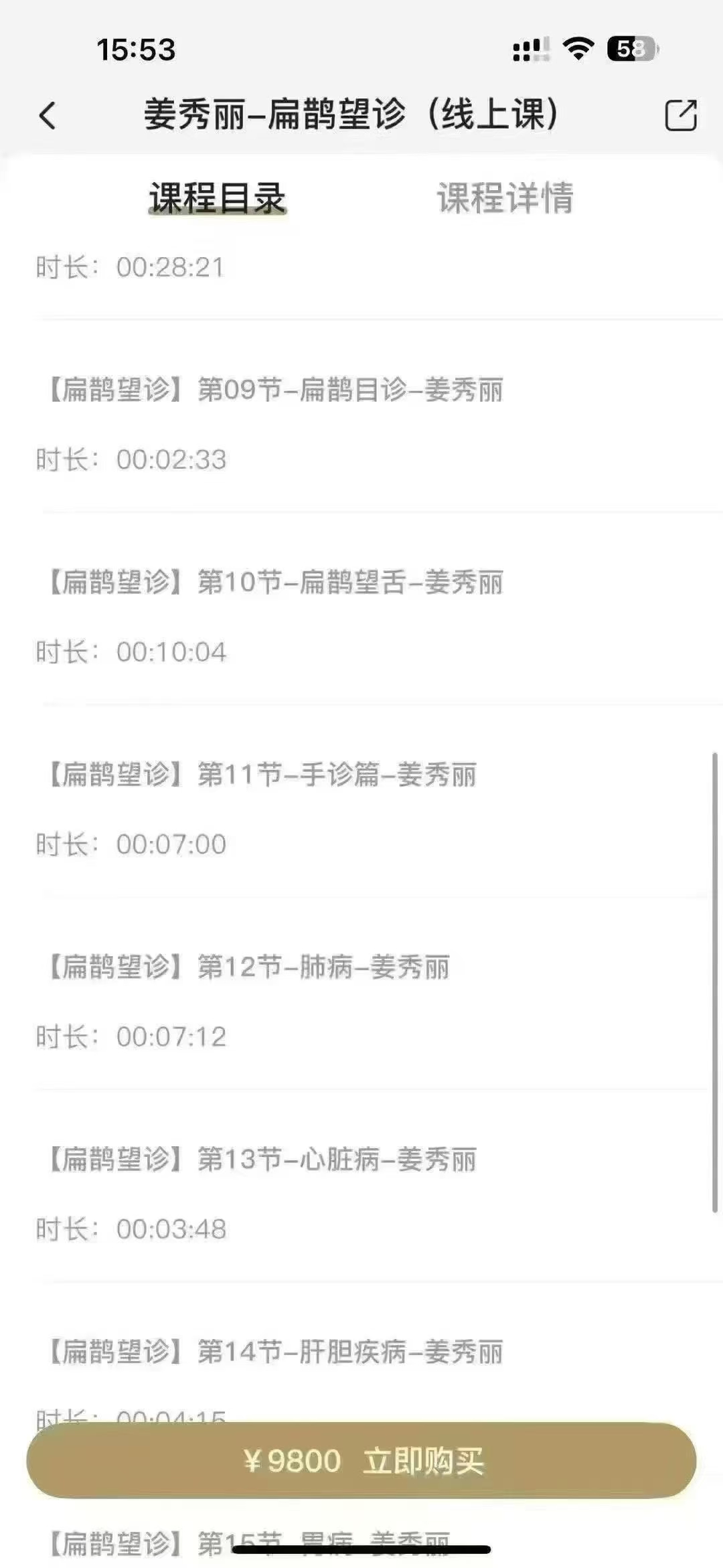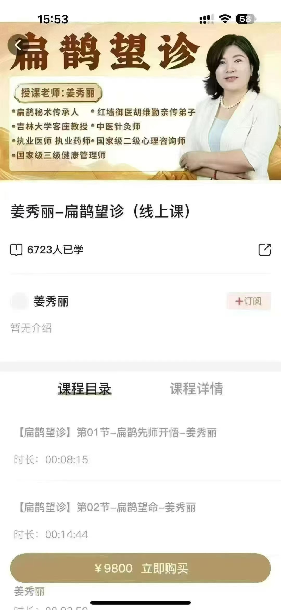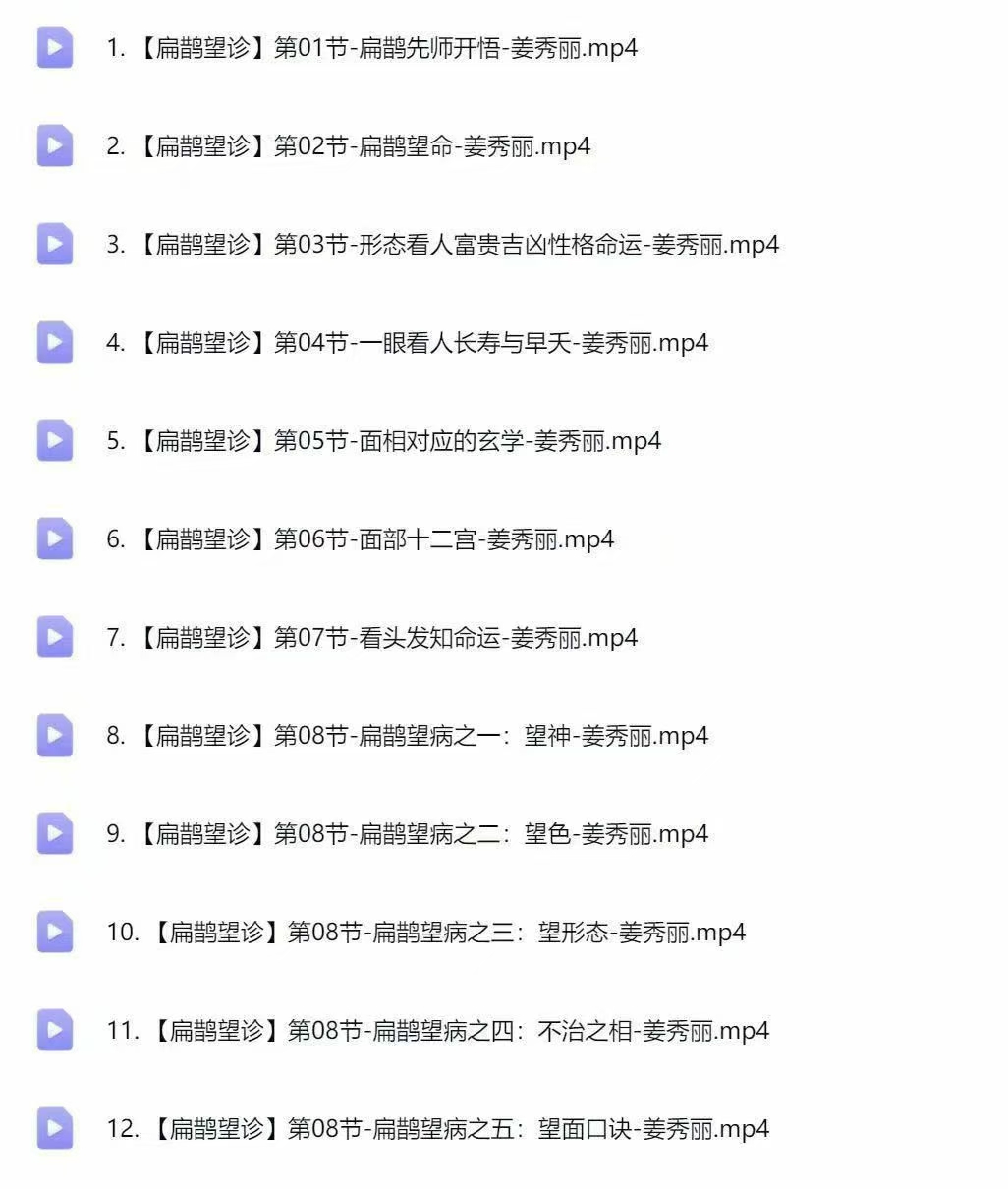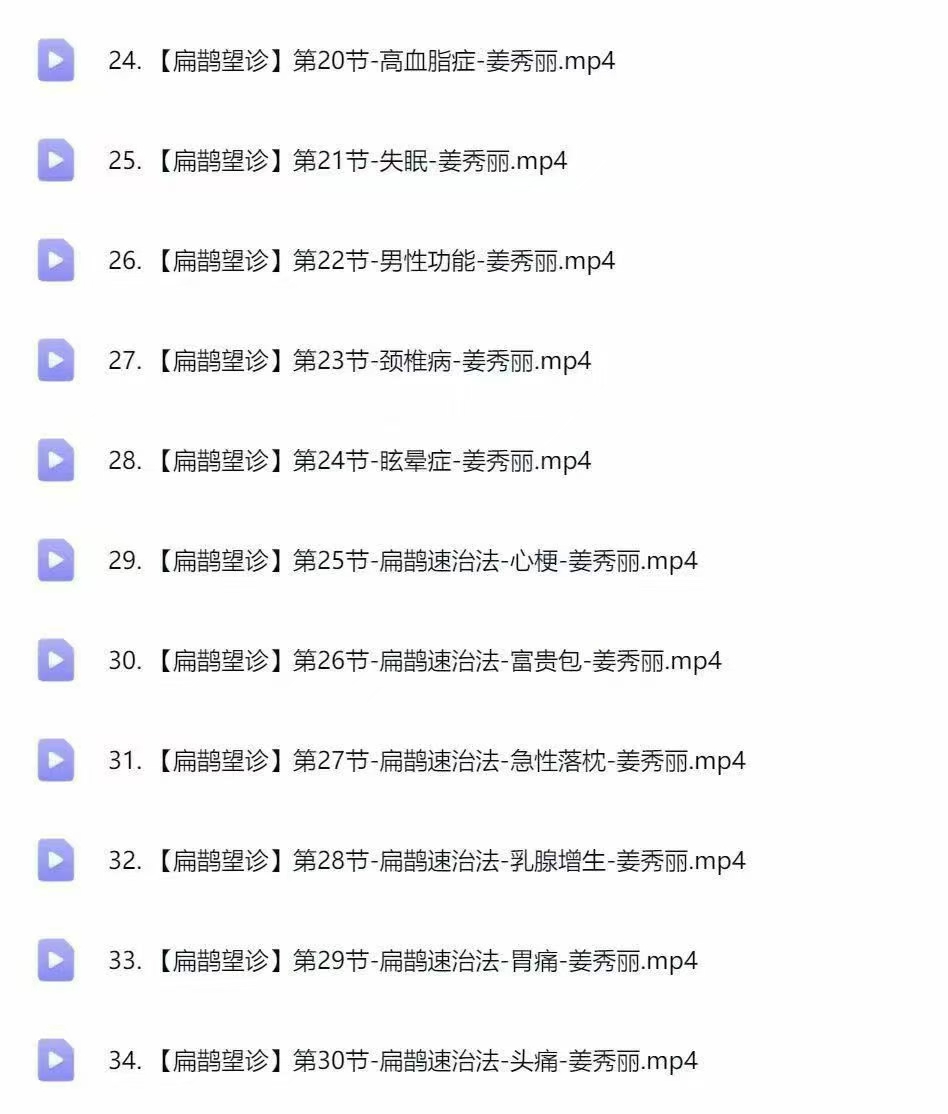姜秀丽扁鹊望诊 全34讲视频教你维多望诊:面诊、手诊、目诊、舌统诊统传授十三代秘传:针.法、秘.方、秘.术、秘.法多法选择!➡【一眼望出.心.脏.问.题】➡【一望眼出.高.血.压】➡ 祖传.降.压.针.法.公开!➡【一望眼出.高.血.糖】➡【一眼望出.男.性.隐.疾】课程目录:第01节-扁鹊先师开悟第02节-扁鹊望命第03节-形态看人富吉贵凶性格命运第04节-一眼看人寿长与早天第05节-面相应对的玄学第06节-面部十二宫第07节-看头知发命运第08节-扁鹊望神第09节-扁鹊目诊第10节-扁鹊望舌第11节-手诊篇第12节-肺病第13节-心脏病第14节-肝胆疾病第15节-胃病第16节-肠病第17节-ru腺病第18节-子gong病第19节-痛经、吸毒、艾zi病第20节-高血脂症第21节-失眠第22节-男xing功能第23节-颈椎病第24节-眩晕症第25节-扁速鹊治法-心梗第26节-扁鹊治速法-富贵包第27节-扁鹊速治法-急性落枕第28节-扁鹊速治法-ru腺增生第29节-扁速鹊治法-胃痛第30节-扁速鹊治法-头痛本故事纯属虚构,如有雷同纯属巧合