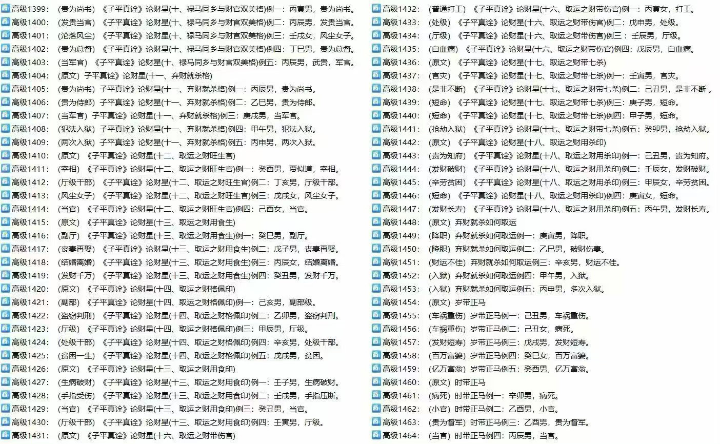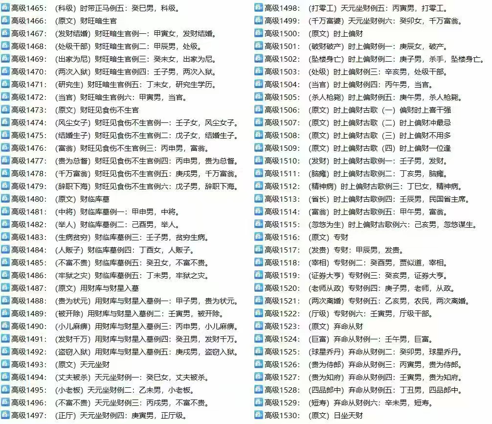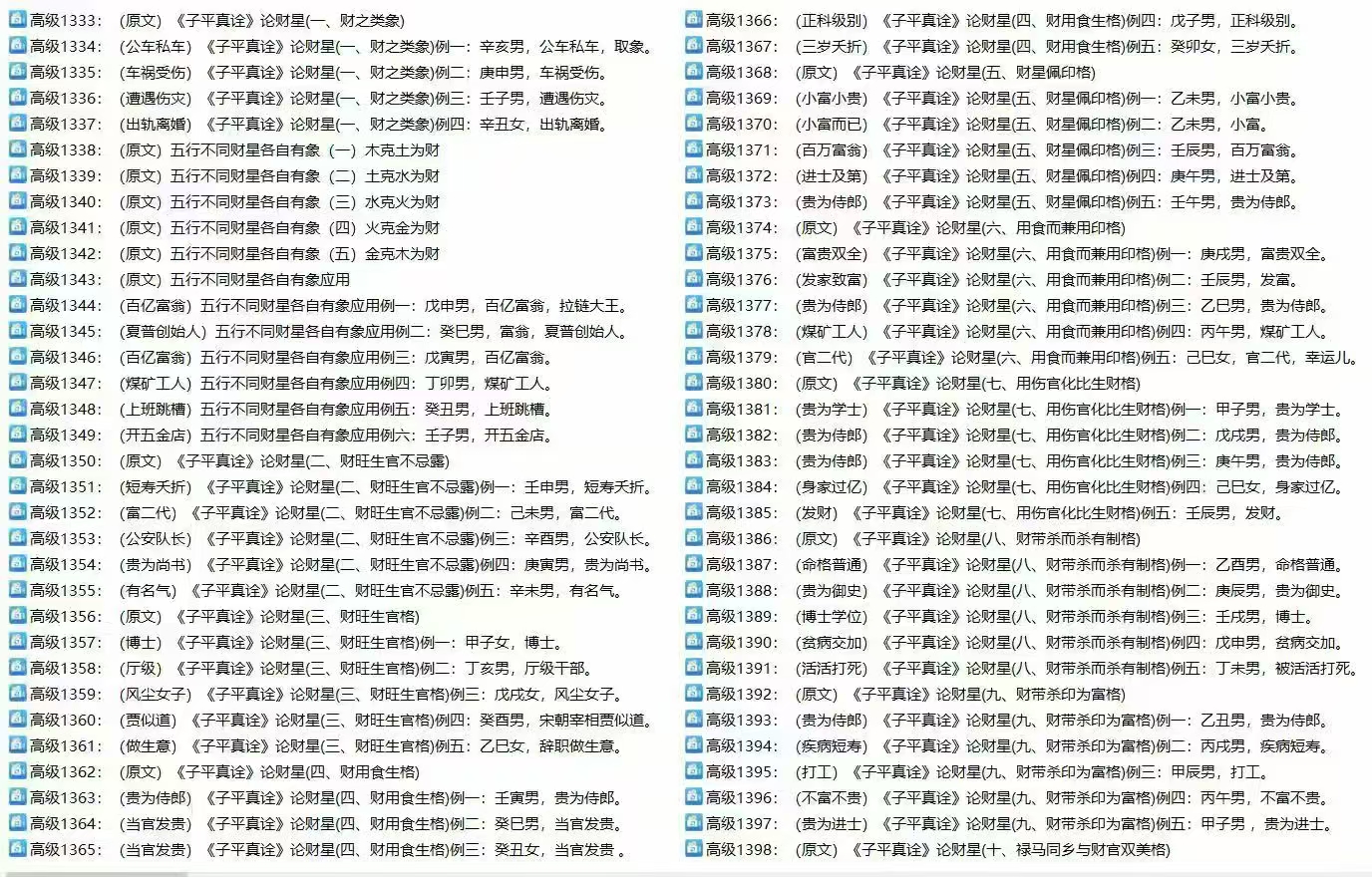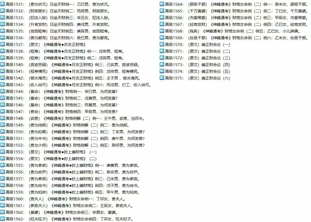 吕老师最新《八字实战高级班第六章》教学视频243集,具体目录看图所示:高级1532:(财政部长)日坐天财例二:丙辰男,财政部长。高级1533:(犯法入狱)日坐天财例三:辛丑女,犯法入狱。高级1534:(升官发财)日坐天财例四:庚戌男,升官发财。高级1535:(贫困短寿)日坐天财例五:庚辰男,贫困短寿。高级1536: (贵为都宪)日坐天财例六:癸已男,贵为都宪。高级1537: (原文)《神峰通考·月支正财格》药:高级1538: (短寿)《神峰通考月支正财格》例一:戊申男,短寿。高级1539: (短寿)《神峰通考月支正财格》例二:戊辰男,短寿。高级1540: (奔波劳碌)《神峰通考·月支正财格》例三:己亥男,奔波劳碌。高级1541: (短寿横死)《神峰通考·月支正财格》例四:戊申男,短寿横死。高级1542: (被水淹死)《神峰通考·月支正财格》例五:壬子男,被淹死。高级1543: (收入尚可)《神峰通考月支正财格》例六:丙戌男,打工,收入尚可。高级1544: (富命)《神峰通考》财格例一:辛已男,为何发富?高级1545: (富命)《神峰通考》财格例二:戊寅男,为何发富?高级1546: (富命) 《神峰通考》财格例三:丙寅男,为何发富?高级1547: (贵命)《神峰通考》财格例四:甲辰男,为何发贵?高级1548: (武贵)《神峰通考》财格例解(二)例一:壬午男,武贵,当司令。高级1549: (贵为侍郎)《神峰通考》财格例解(二)例二:贵为侍郎。高级1550: (贵为知阁)《神峰通考》财格例解(二)例三:丁亥男,为何发贵?高级1551:(贵为中书)《神峰通考》财格例解(二)例四:庚午男,为何发贵?高级1552:(贵为少师)《神峰通考》财格例解(二)例五:癸卯男,为何发贵?高级1553: :(原文)《神峰通考·时上偏财格》(一)高级1554: (原文)《神峰通考·时上偏财格》(二)高级1558: (贵为尚书)《神峰通考时上偏财格》例四:戊子男,贵为尚书。高级1559: (贵为知府)《神峰通考·时上偏财格》例五:甲午男,贵为知府。高级1560: (贵夫人)《神峰通考》财格女命例一:丁卯女,贵夫人。高级1561:(参政夫人)《神峰通考》财格女命例二:壬辰女,参政夫人。高级1562:(富婆)《神峰通考》财格女命例三:辛酉女,富婆。高级1563:(旺夫旺子)《神峰通考》财格女命例四:丁卯女,旺夫旺子。