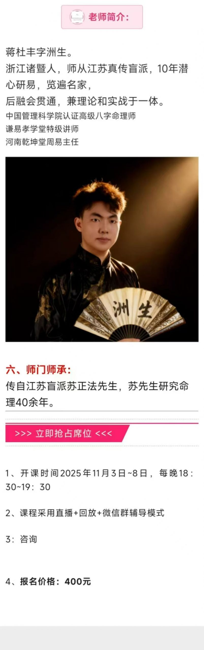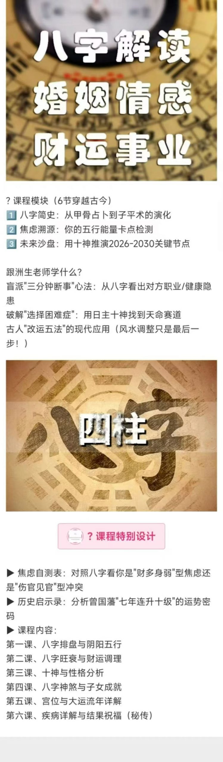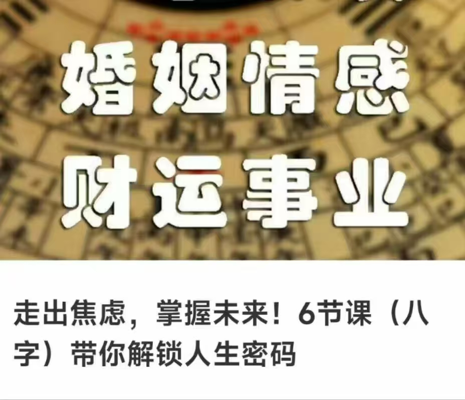八字带你走出焦虑,掌握未来!6节视频课带你解锁人生密码现代焦虑的古老解法为什么学了那么多道理,依然过不好这一生?因为时间错了——八字中的”比劫夺财”时段:拼命投资=钱包出血”食伤生财”大运:躺平反而机遇自动上门本课程将给你一套人生时间管理术让你明白:✅ 焦虑期可能是命运的”系统升级提示”✅ 真正的努力是”在对的时间做对的事”课程模块(6节穿越古今)1️⃣ 八字简史:从甲骨占卜到子平术的演化2️⃣ 焦虑溯源:你的五行能量卡点检测3️⃣ 未来沙盘:用十神推演2026-2030关键节点跟洲生老师学什么?盲派”三分钟断事”心法:从八字看出对方职业/健康隐患破解”选择困难症”:用日主十神找到天命赛道古人”改运五法”的现代应用(风水调整只是最后一步!)▶ 课程内容:第一课、八字排盘与阴阳五行第二课、八字旺衰与财运调理第三课、十神与性格分析第四课、八字神煞与子女成就第五课、宫位与大运流年详解第六课、疾病详解与结果祝福(秘传)