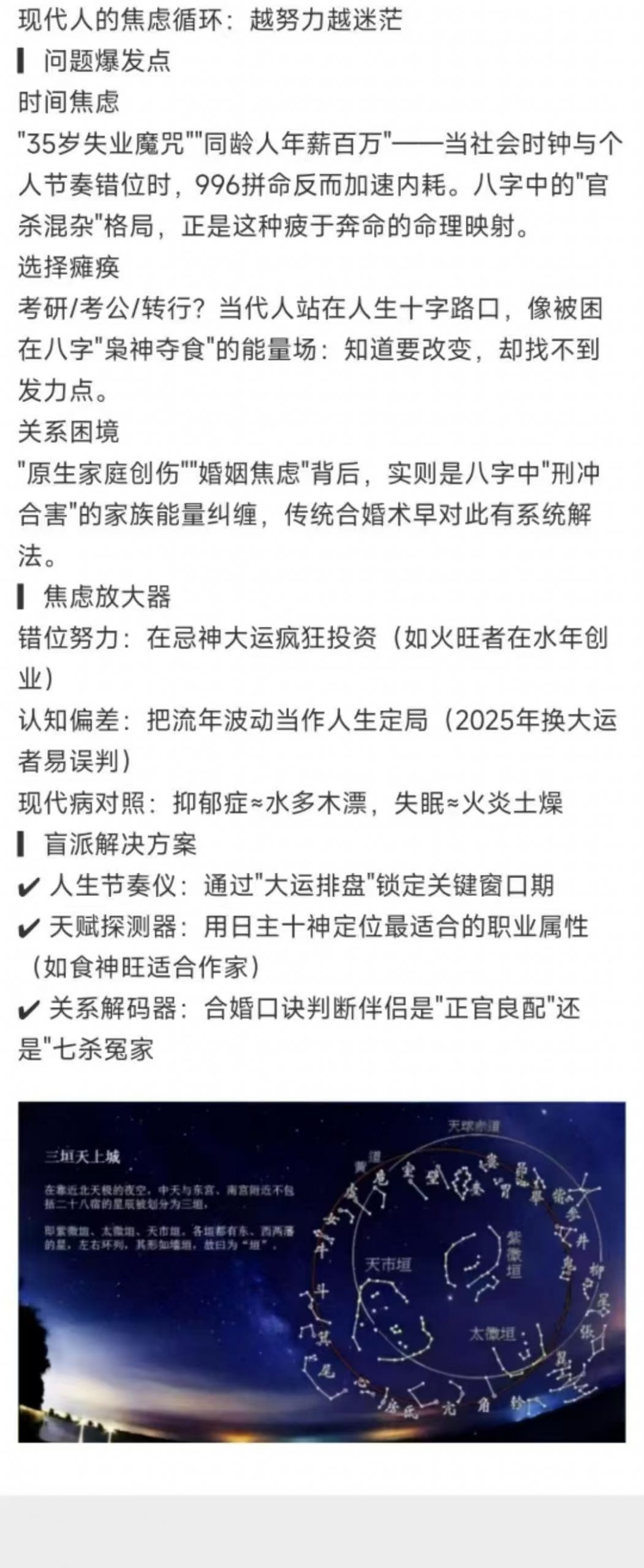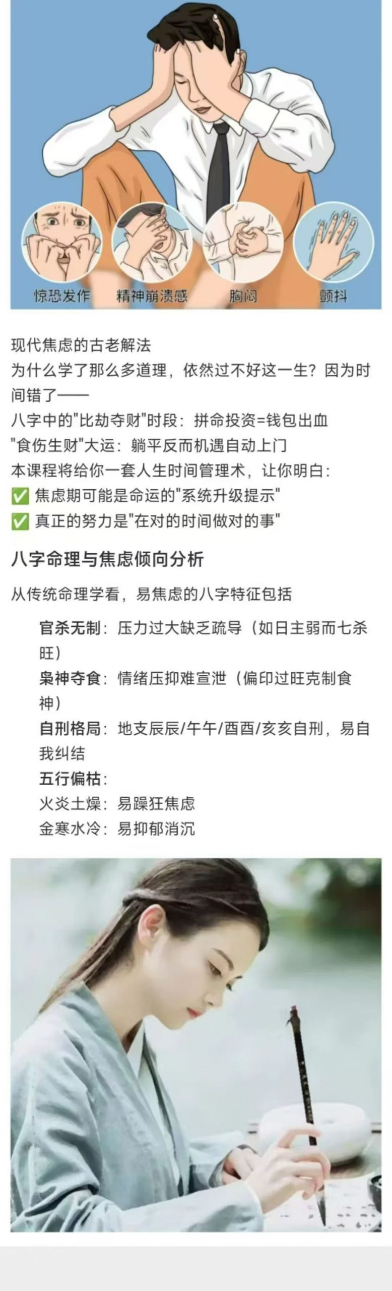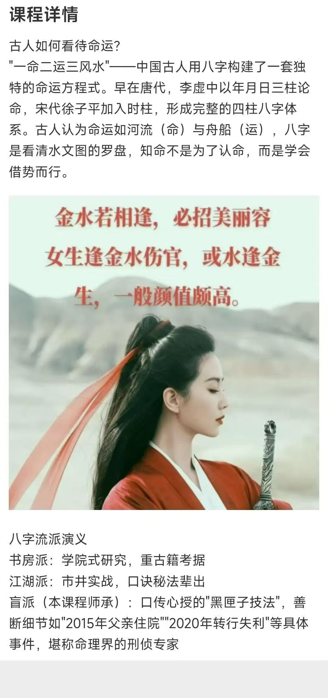 八字带你走出焦虑,掌握未来!6节视频课带你解锁人生密码现代焦虑的古老解法为什么学了那么多道理,依然过不好这一生?因为时间错了——八字中的”比劫夺财”时段:拼命投资=钱包出血”食伤生财”大运:躺平反而机遇自动上门本课程将给你一套人生时间管理术让你明白:✅ 焦虑期可能是命运的”系统升级提示”✅ 真正的努力是”在对的时间做对的事”课程模块(6节穿越古今)1️⃣ 八字简史:从甲骨占卜到子平术的演化2️⃣ 焦虑溯源:你的五行能量卡点检测3️⃣ 未来沙盘:用十神推演2026-2030关键节点跟洲生老师学什么?盲派”三分钟断事”心法:从八字看出对方职业/健康隐患破解”选择困难症”:用日主十神找到天命赛道古人”改运五法”的现代应用(风水调整只是最后一步!)▶ 课程内容:第一课、八字排盘与阴阳五行第二课、八字旺衰与财运调理第三课、十神与性格分析第四课、八字神煞与子女成就第五课、宫位与大运流年详解第六课、疾病详解与结果祝福(秘传)
