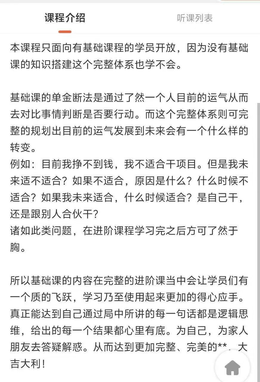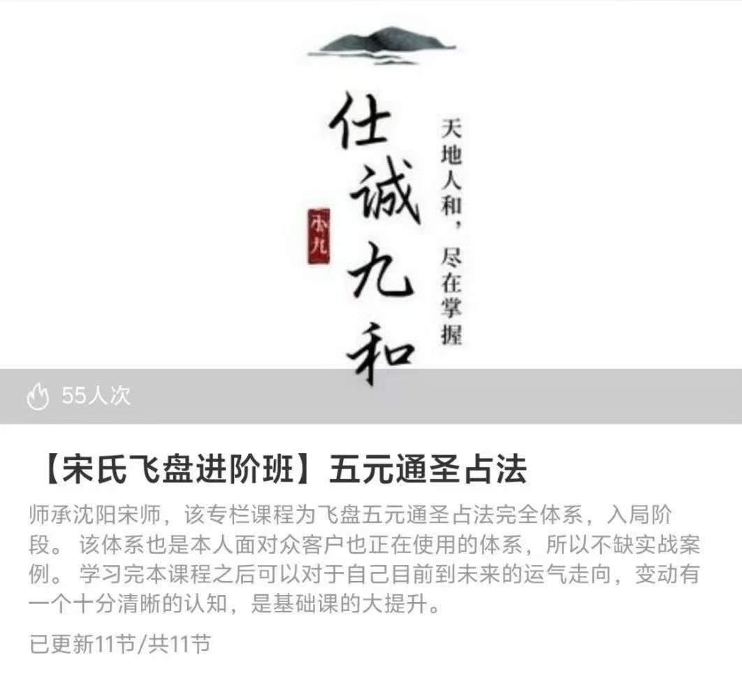师承沈阳宋师,该专栏课程为飞盘五元通圣占法完全体系,入局阶段。该体系也是本人面对众客户也正在使用的体系,所以不缺实战案例。学习完本课程之后可以对于自己目前到未来的运气走向,变动有一个十分清晰的认知,是基础课的大提升