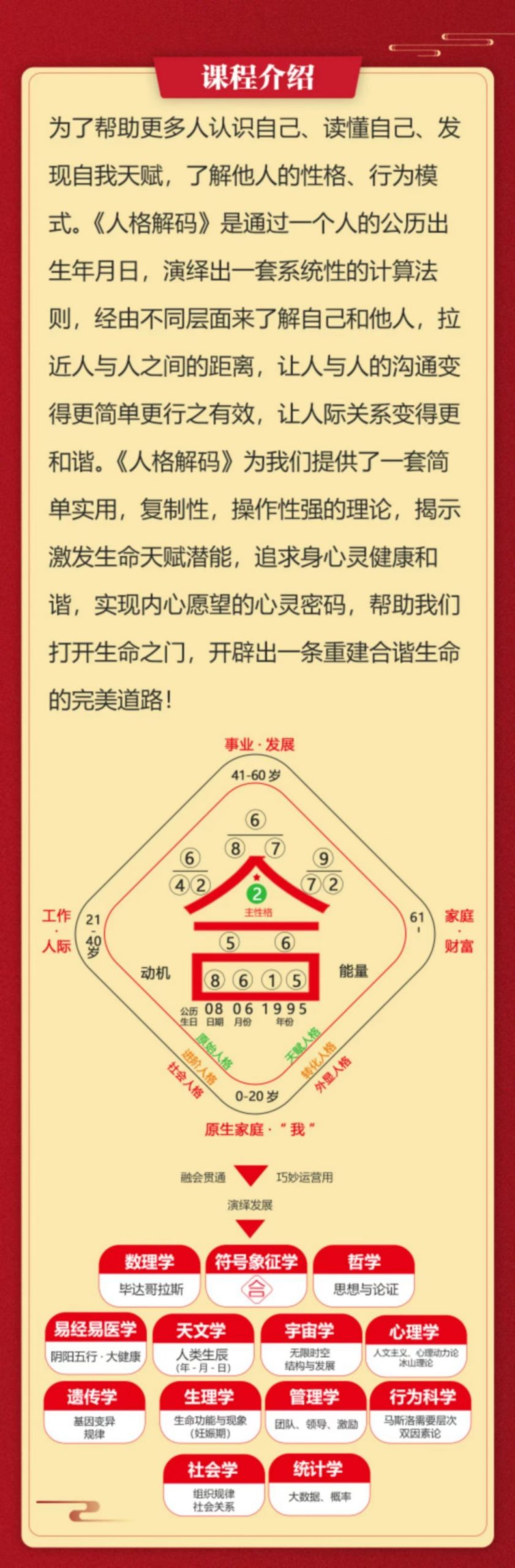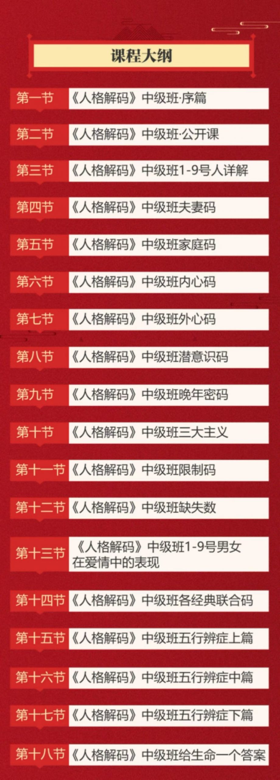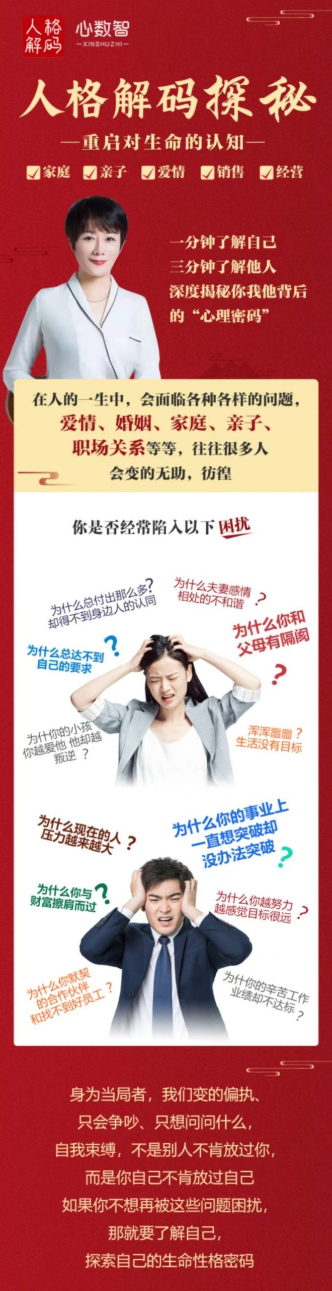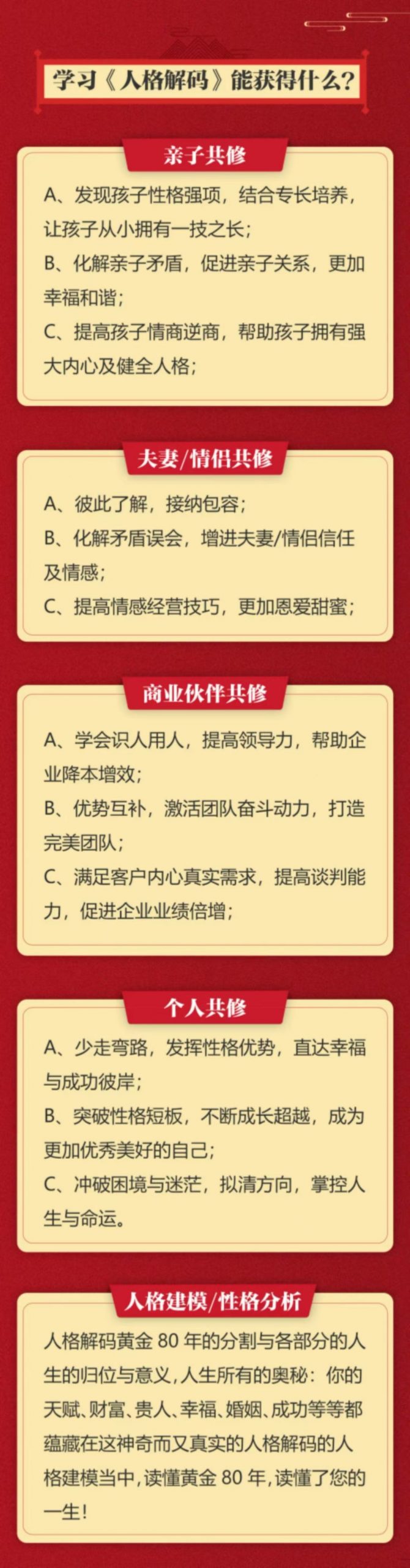 《人格解码》初级班课程➕️ 《人格解码》中级班课程!共两套29.9🧧课程亮点✅ 快速识人识己:1分钟读懂自己,3分钟看透他人✅ 全场景覆盖:爱情💑、家庭🏠、亲子👨👩👧👦、职场💼、财富💰✅ 深度解析:揭秘行为背后的“心理密码”,打破人生困局✅ 实用导向:解决实际关系难题,助你目标清晰、突破瓶颈🎯 核心价值✨ 停止盲目付出,获得认同✨ 化解夫妻矛盾、亲子隔阂✨ 明确事业方向,吸引财富与贵人✨ 摆脱迷茫,找到生活目标感📌 适合谁学?· 常感付出不被认可的你😔· 夫妻沟通不畅、亲子关系紧张的你🏠· 事业遇瓶颈、努力却难突破的你💼· 对员工、合作伙伴难以把握的管理者👥· 渴望自我成长、活出清醒人生的你🚀💬 你不是在寻找答案,而是需要一把钥匙——🔑 从“为什么”到“怎么办”,重启对生命的认知!