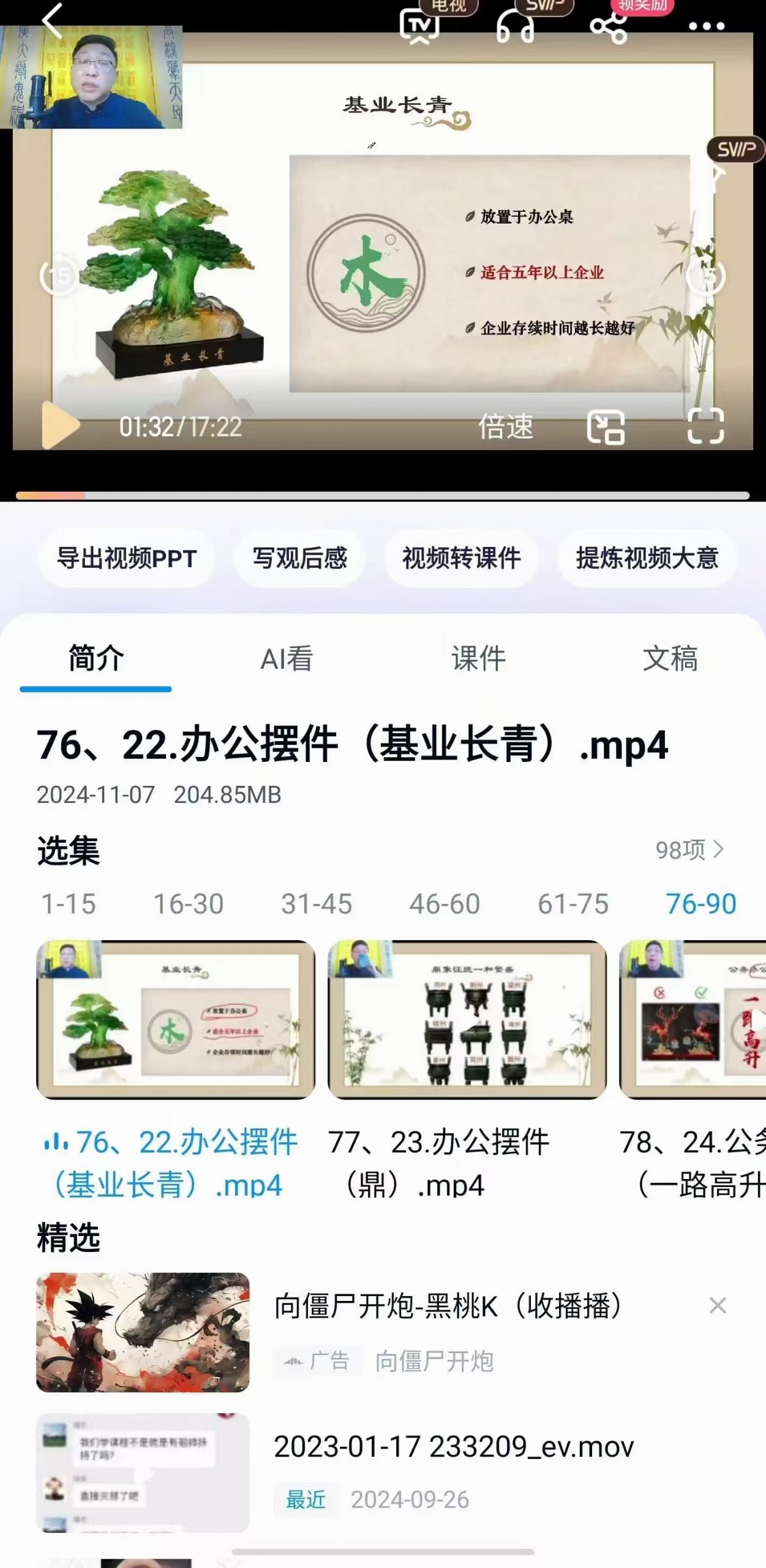 最新范三明《玄天奇门风水》系列视频结缘18元,会员免费得(别人卖128的课)共98集,包含奇门遁甲,风水布局,择日择吉等视频,目录如下:01.八卦五行象意02.三奇六仪(三奇符)03.吉凶格解析04.玄天派奇门遁甲天机决05.断事——找工作应聘06.断事——工作调动07.断事——晋升08.断事——合伙求财_09.断事——开店求财10、10.断事——网络带货求财11、11.断事——外卖滴滴求财12、12.断事——恋爱预测13、13.断事——学业预测14、14.断事——出行预测15、15.断事——官司预测16、16.断事——婚姻预测17、17.5赠课——关于终身局18、17.断事——健康预测(1)19、18.断事——健康预测(2)20、19.破四害——空亡21、20.破四害——入墓22、21.破四害——击刑23、22.破四害——门迫24、23.赠课关于奇门象意25、24.八门——生门26、25.八门——伤门27、26.八门——杜门28、23.八门——休门(1)29、27.八门——景门30、28.八门——死门31、29.八门——惊门32、30.八门——开门33、31.九星——天蓬星34、32.九星——天任星35、33.九星——天冲星36、34.九星——天辅星37、35.九星——天英星38、36.九星——天芮星39、37.九星——天柱星40、38.九星——天心星41、39.八神——值符42、40.八神——腾蛇43、41.八神——太阴44、42.八神——六合45、43.八神——白虎46、44.八神——玄武47、45.八神——九地48、46.八神——九天49、1.招财摆件(貔貅)50、2.招财摆件(金蟾)51、3.招财摆件(招财猫)52、4.招财摆件(聚宝盆)53、5.招财摆件(摇钱树)54、6.招财摆件(玉白菜)55、7.招财摆件(招财进宝)56、8.招财摆件(运财童子).57、9.招财摆件(九转乾坤)58、开光01—佛家道家开光原理详解59、开光02—随身挂件开光与净化60、开光03—观音、佛挂件开光61、开光04—常见风水摆件开光62、开光05—神兽、生肖摆件、文昌塔开光63、开光06—关公、财神像开光64、10.化煞摆件(麒麟)65、11.化煞摆件(龙龟)66、12.化煞摆件(八卦镜)67、13.化煞摆件(泰山石)68、14.化煞摆件(五帝钱)69、15.化煞摆件(七星剑)70、16.夫妻情侣(桃花树)71、17.夫妻情侣(天鹅)72、18.夫妻情侣(鸳鸯)73、19.夫妻情侣(结婚照)74、20.办公摆件(领航舵)75、21.办公摆件(地球仪)76、22.办公摆件(基业长青)77、23.办公摆件(鼎)78、24.公务办公(一路高升)79、25.公务办公(马上封侯).80、26.公务办公(旗)81、27.公务办公(一帆风顺)82、28.公务办公(一飞冲天)83、29.健康摆件(葫芦)84、30.健康摆件(平安水)85、31.健康摆件(寿桃)86、32.八宫立极法方向测量立极尺的使用法87、33.罗盘使用实操88、34.玄天风水五行法基础(一)89、35.玄天风水五行法基础(二)90、36五行摆件.MP491、住宅风水92、家居风水—学业、桃花93、办公及店铺风水94、实战案例95、择日(1)96、择日(2)97、择日(3)98、择日(4)